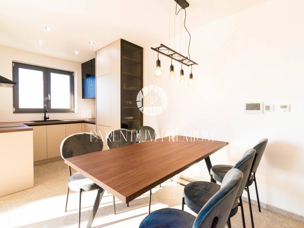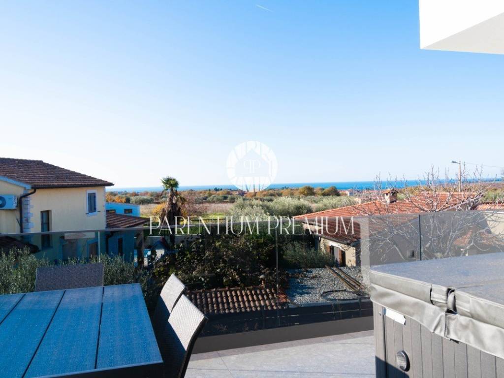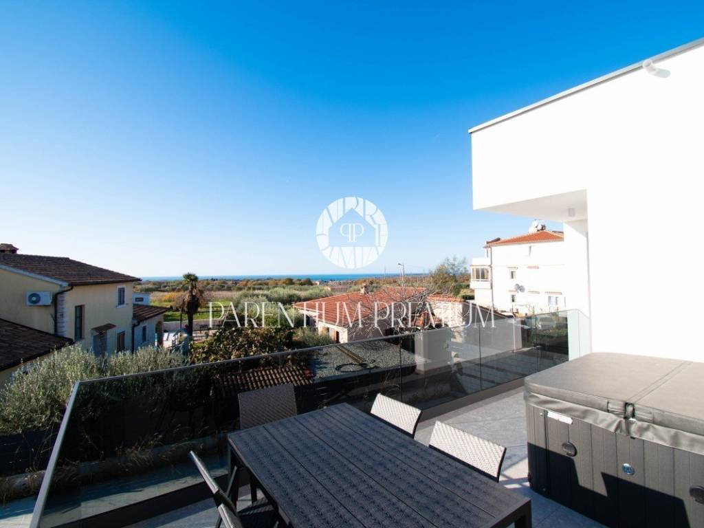 Near Poreč, this excellent quality apartment is located on the 1st floor of a modern building with a jacuzzi on the terrace, with a total area of 96,56m2.