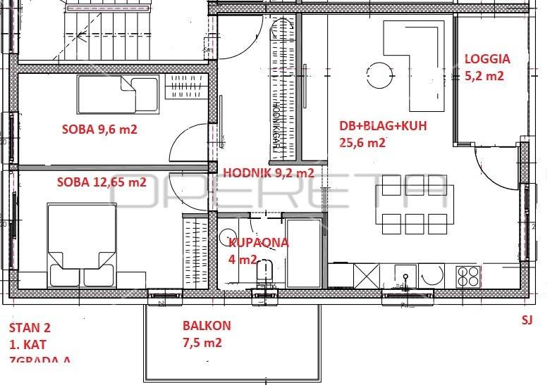 PRODAJA, STAN, Velika Gorica 70,05 m2 ZGD A S2 Manja zgrada sa samo 4 stana. Trosoban stan sastoji se od " open space" dnevnog boravka, blagovaonice i kuhinje s izlazom na loggiu, dvije sobe i kupaonice s wc-om. Istoćne je i zapadne orijentacije. U cijeni je garaža, vanjsko parkirno mjesto i spremište od 7,5m2. Odlična lokacija na par minuta pješaćke udaljenosti od osnovne škole, trgovine i autobusne stanice, kao i do svih ostali sadržaja važnih za ugodan život. Useljenje 11/2026.