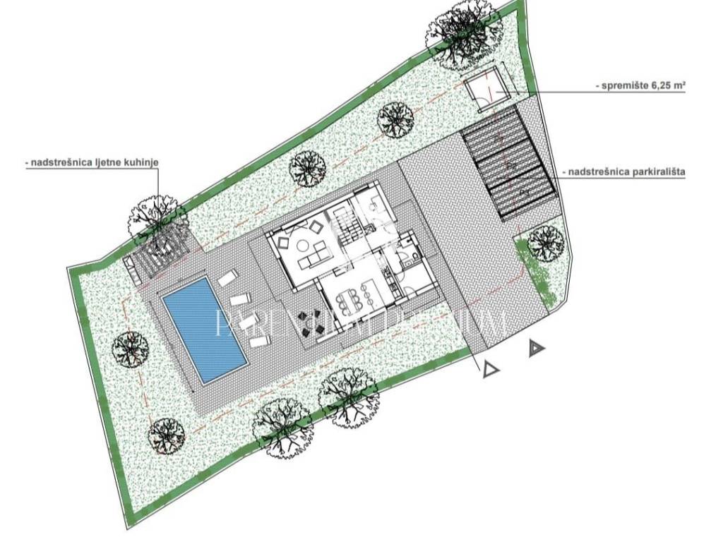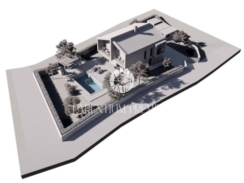 Predviđeni objekt je modernog koncepta sa velikim bazenom, ljetnom kuhinjom i natkrivenim parkingom u dvorištu.