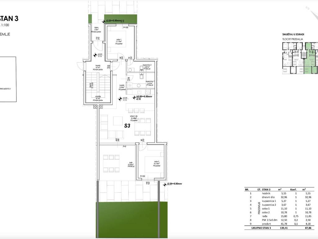 Stan S3 – prizemlje s vrtom Stan S3 nalazi se u prizemlju moderne novogradnje te ima ukupnu obračunsku površinu od 87,86 m². Odlikuje ga funkcionalan raspored prostorija, puno prirodnog svjetla te privatni vrt koji pruža dodatni prostor za boravak na otvorenom. Stan se sastoji od ulaznog hodnika, prostranog dnevnog boravka s kuhinjom i blagovaonicom površine 32,96 m², dvije spavaće sobe te dvije kupaonice, što osigurava udobnost i praktičnost za svakodnevni život. Iz dnevnog boravka izlazi se na natkrivenu lođu površine 15,80 m², idealnu za opuštanje, druženje i uživanje na svježem zraku. Posebna prednost ovog stana je privatni vrt površine približno 41,78 m², koji omogućuje uređenje prostora za odmor, dječju igru ili vlastitu zelenu oazu. Uz stan dolazi i osigurano parkirno mjesto. Raspored prostorija: hodnik – 5,55 m²; dnevni boravak + kuhinja + blagovaonica – 32,96 m²; kupaonica 1 – 5,27 m²; kupaonica 2 – 3,67 m²; spavaća soba 1 – 11,10 m²; spavaća soba 2 – 10,78 m²; lođa – 15,80 m². Stan je idealan za stalni boravak, odmor ili investiciju za turistički najam, zahvaljujući funkcionalnom rasporedu, privatnom vrtu i blizini mora.