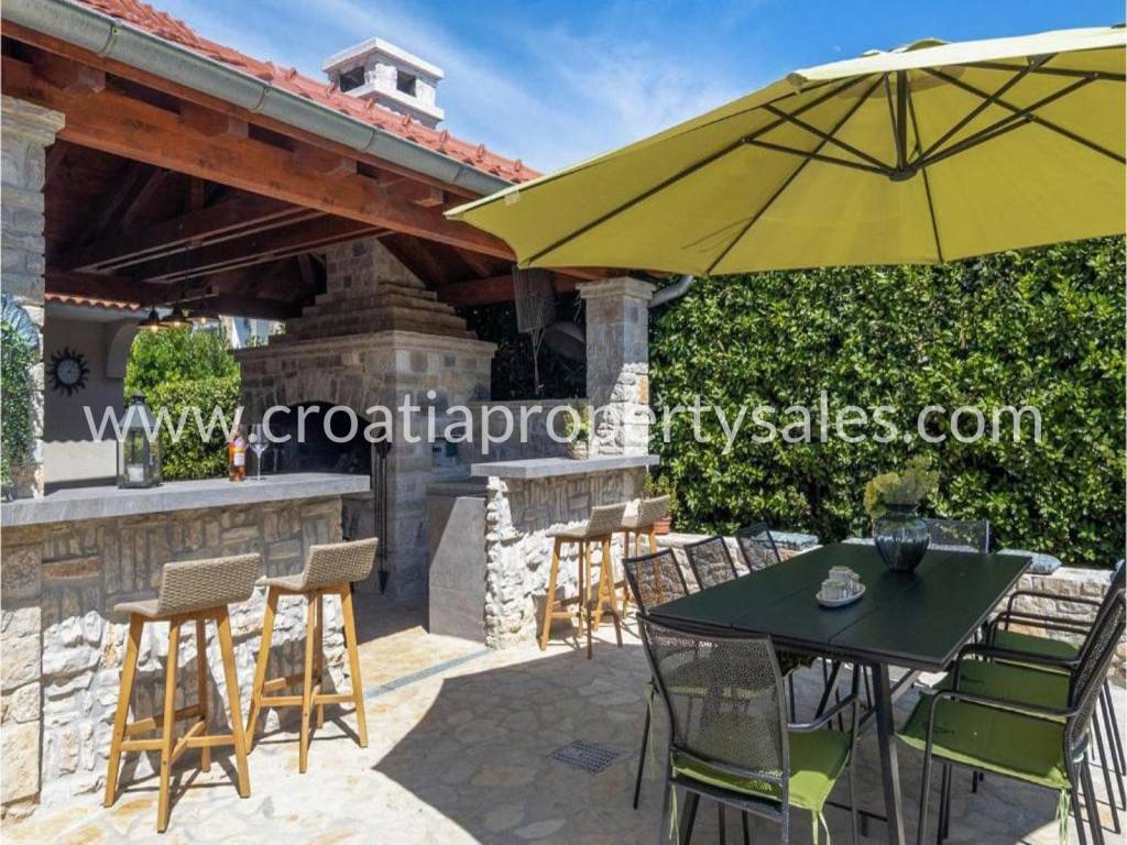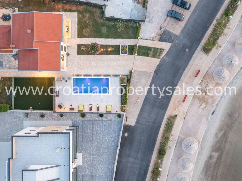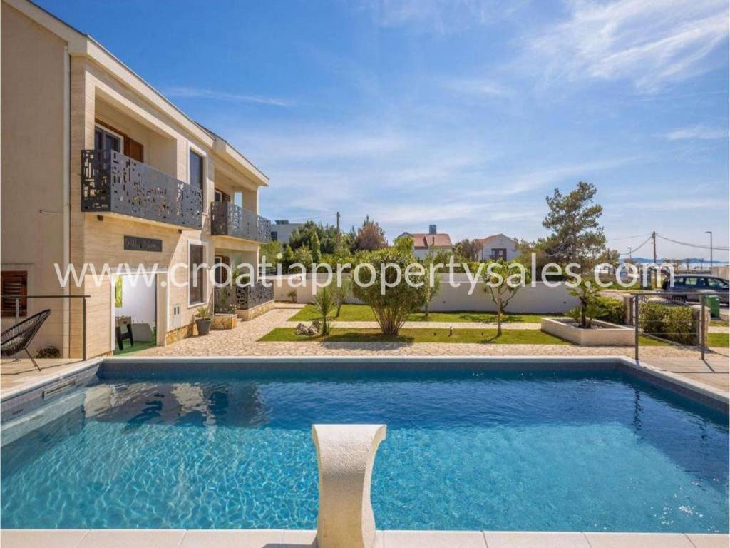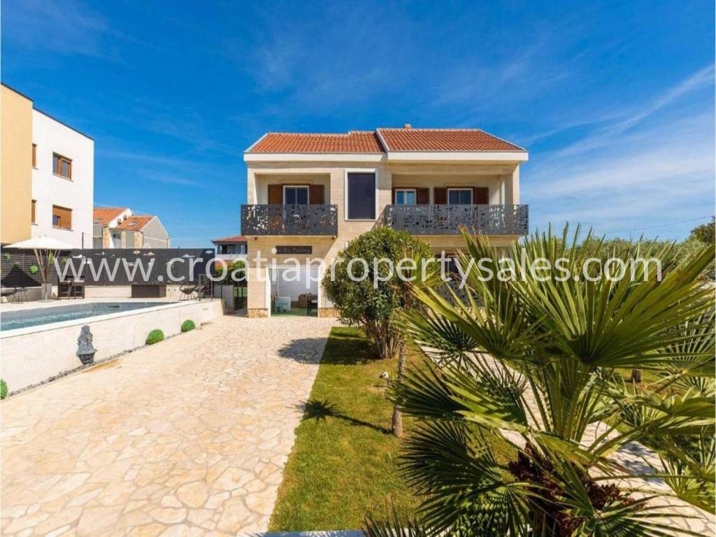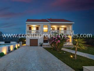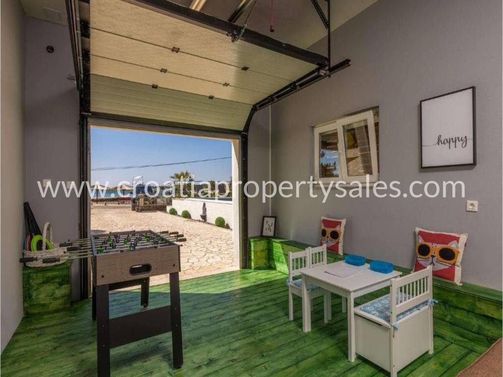 Traditional house, luxuriously decorated with a large outdoor heated swimming pool, large garden, football court and garage in the first row to the sea. The house consists of 5 bedrooms and 4 bathrooms spread over two floors. Each bedroom has its own private balcony. The ground floor consists of a living room, open plan kitchen/ dining area, bedroom, bathroom and a garage (currently used as a games room) The first floor consists of 4 bedrooms each with a balcony and 3 bathrooms. There is a large covered BBQ area with an outdoor kitchen perfect for entertaining guests. The heated outdoor swimming pool of 36m2 can be enjoyed almost all year round. Zadar airport is 30 minutes away.