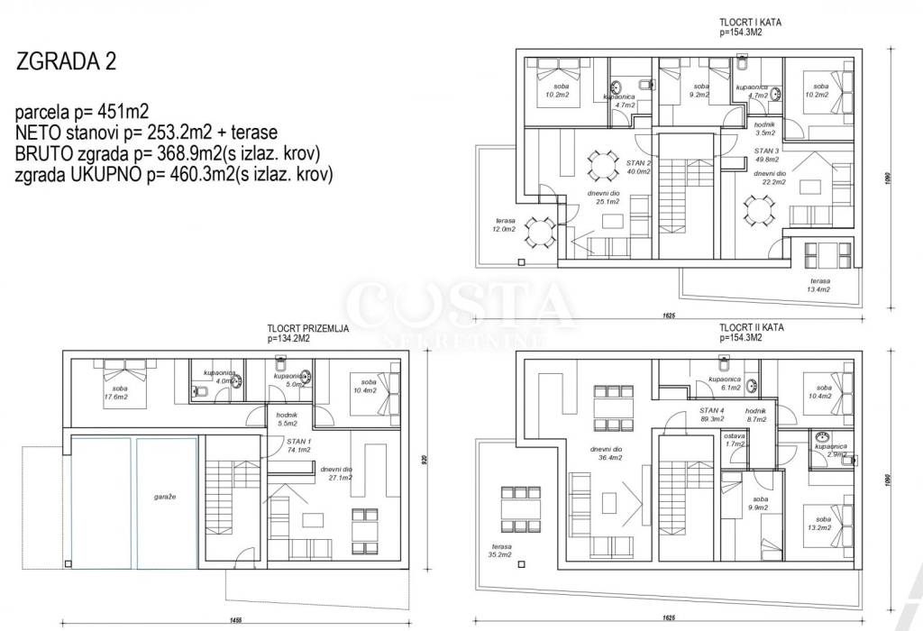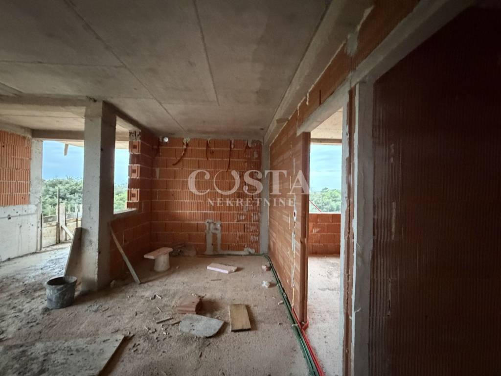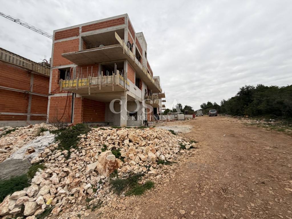 A modern apartment under construction in Petrčane near Zadar is for sale. The apartment with a living area of 89.3 m2 is located on the second floor of a smaller residential building with 4 units within a complex of five modern buildings. It consists of a living room, kitchen and dining room, three bedrooms, two bathrooms, a hallway and a covered terrace of an additional 35 m2. The apartment also has a roof terrace and two parking spaces. The total selling area of the apartment, including the annexes, is 111.86 m2.