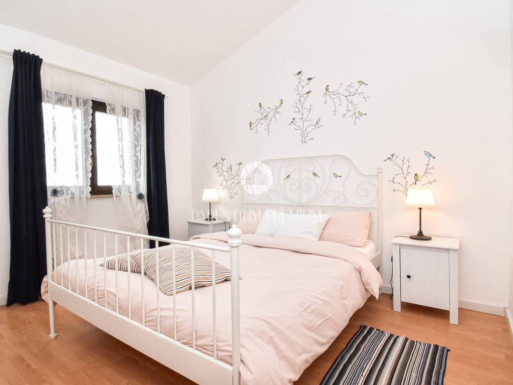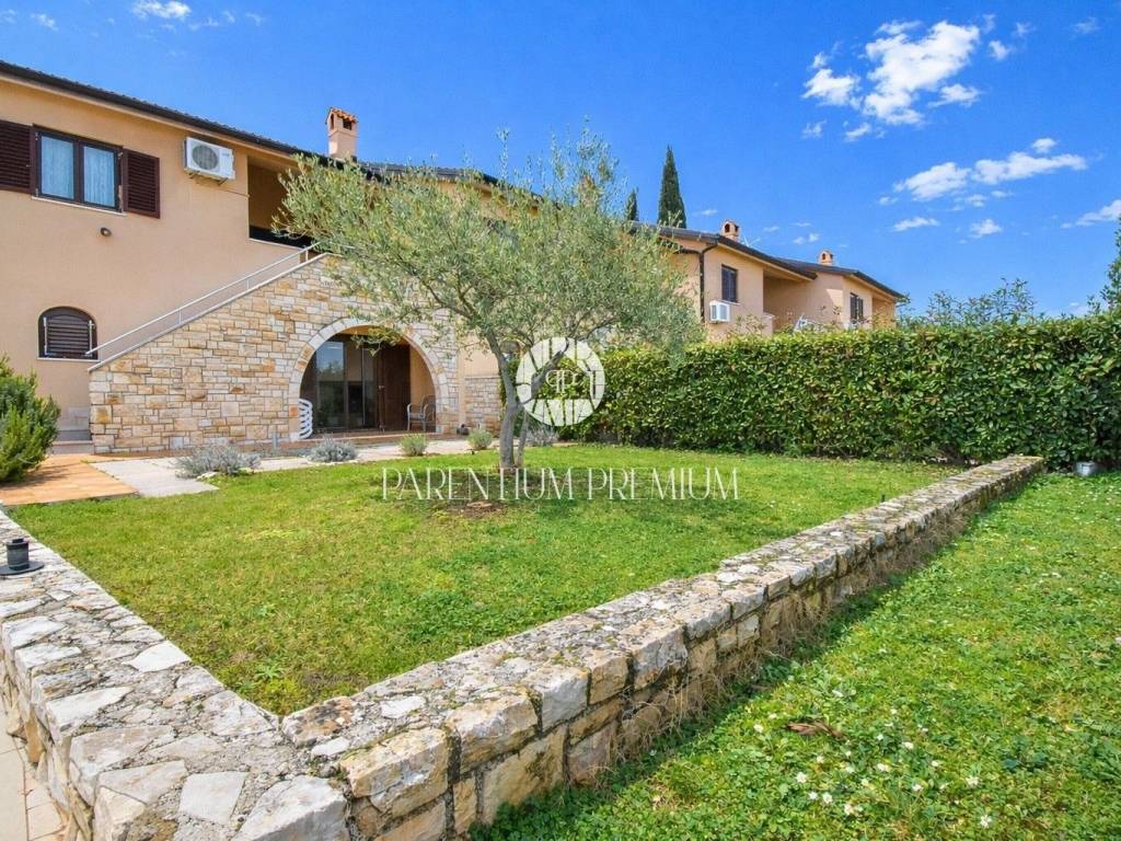 Located in a peaceful and well-maintained settlement in the area of Poreč, this attractive terraced house offers an open panoramic sea view and access to a shared swimming pool, within a harmonious complex of nine houses currently used for private purposes and tourist rentals.