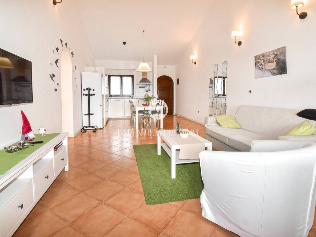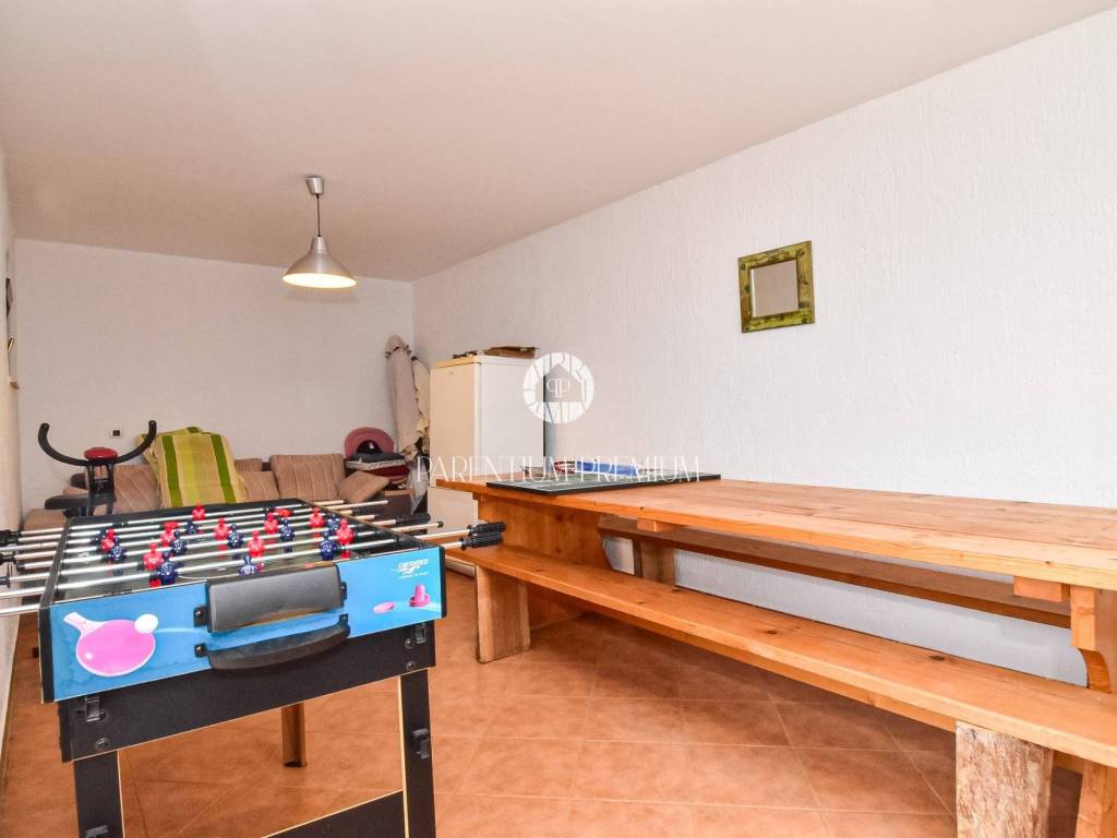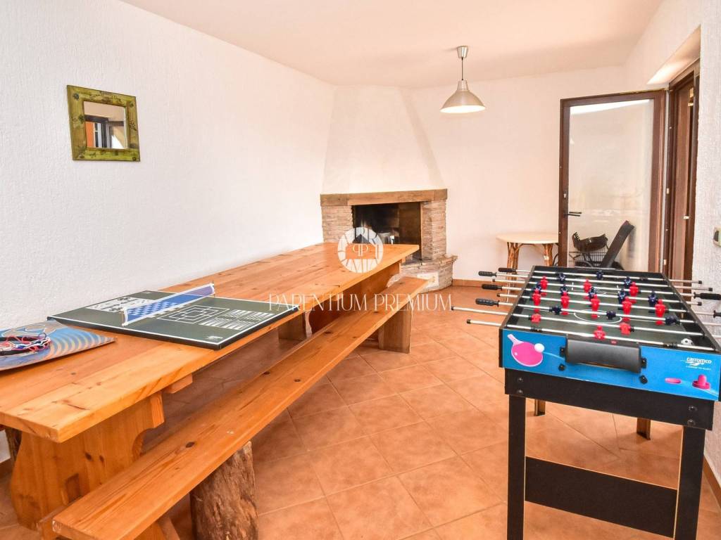 From the terrace, external stairs lead down to a private courtyard where a spacious tavern with a fireplace is located, ideal for gatherings throughout the year. Heating and cooling are provided by air conditioning units, ensuring comfort in all seasons.