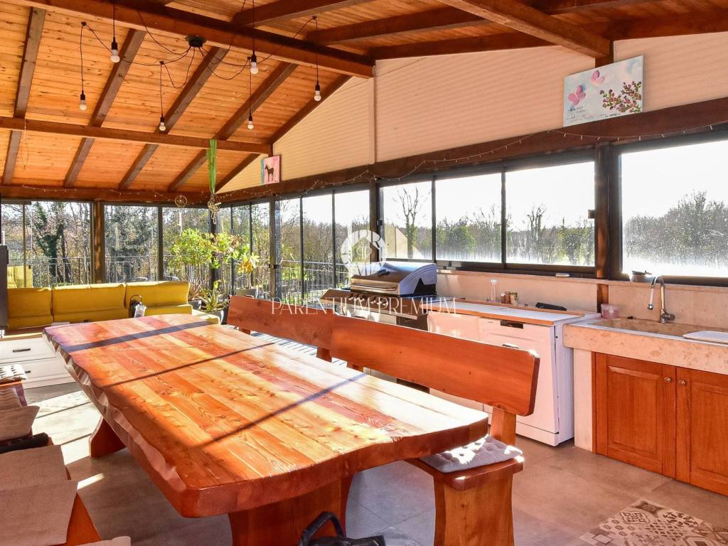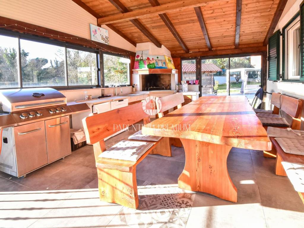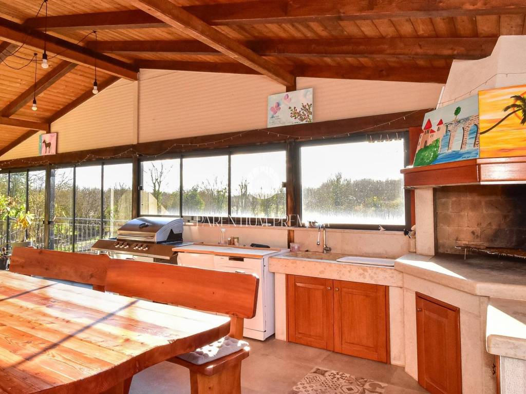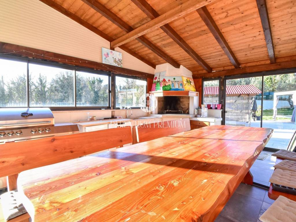 A highlight of the property is the large covered terrace enclosed with glass walls, equipped with a summer kitchen and dining area an ideal space for year-round gatherings, with direct access to the pool and sunbathing area.