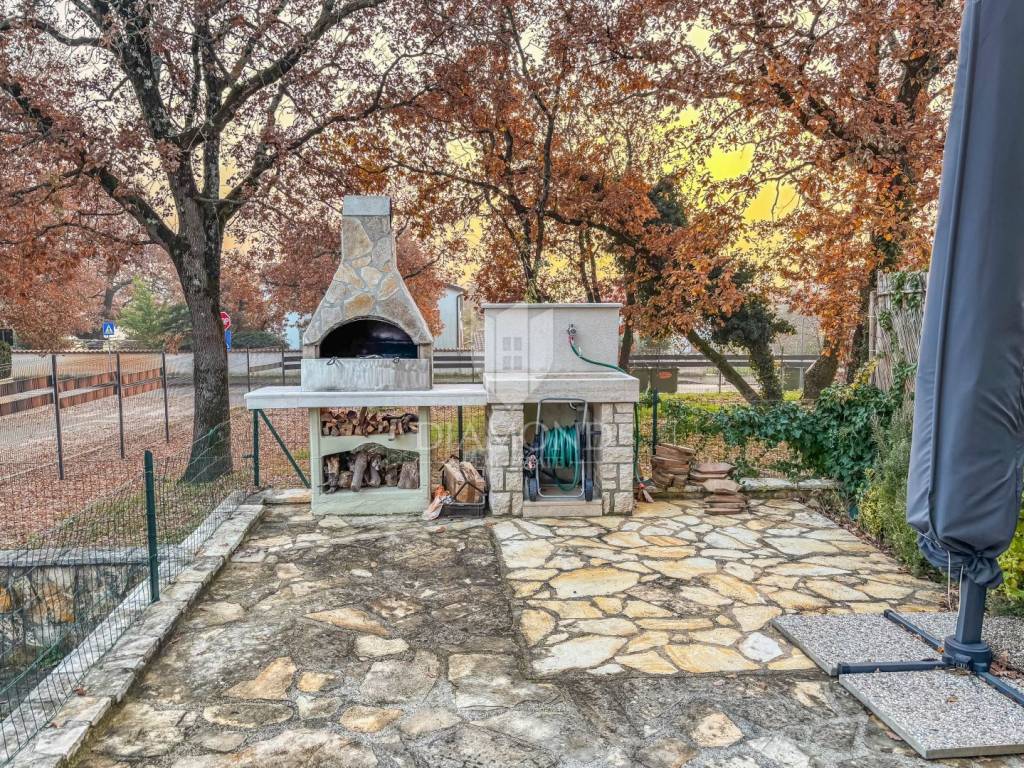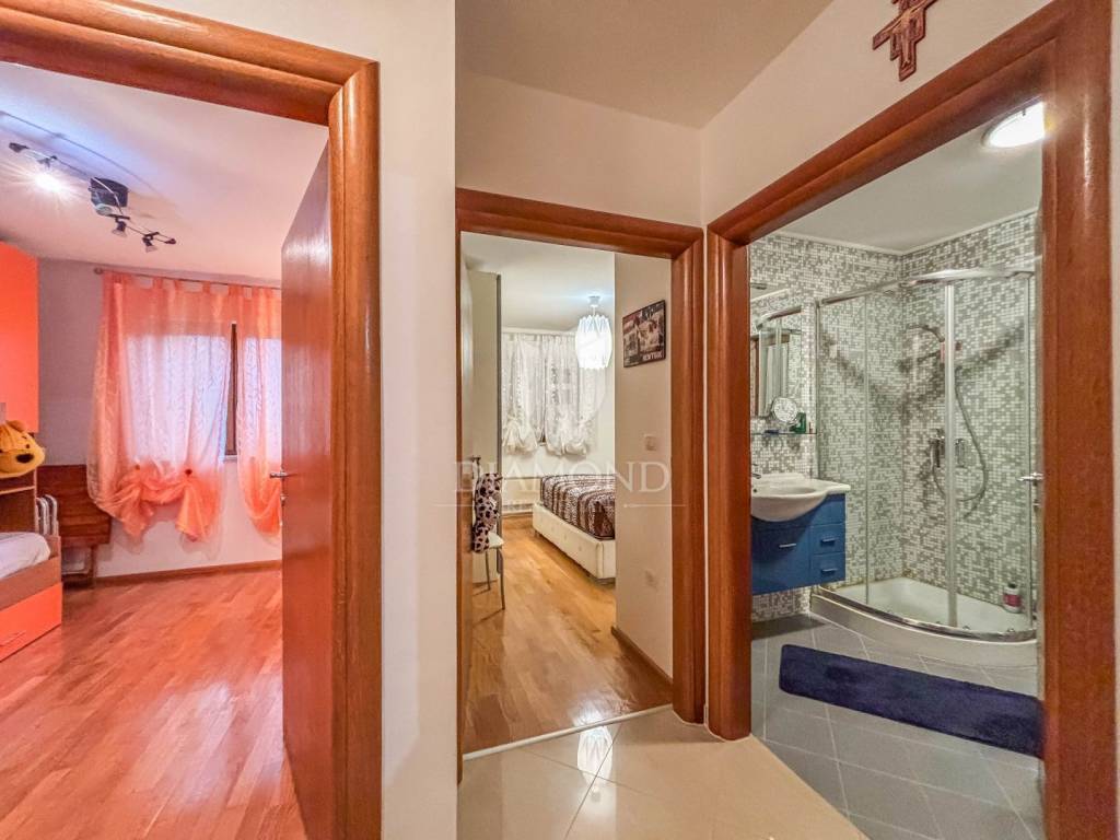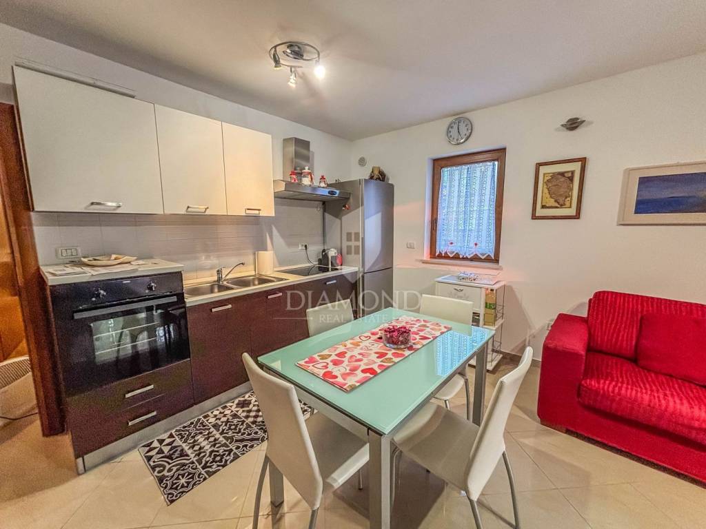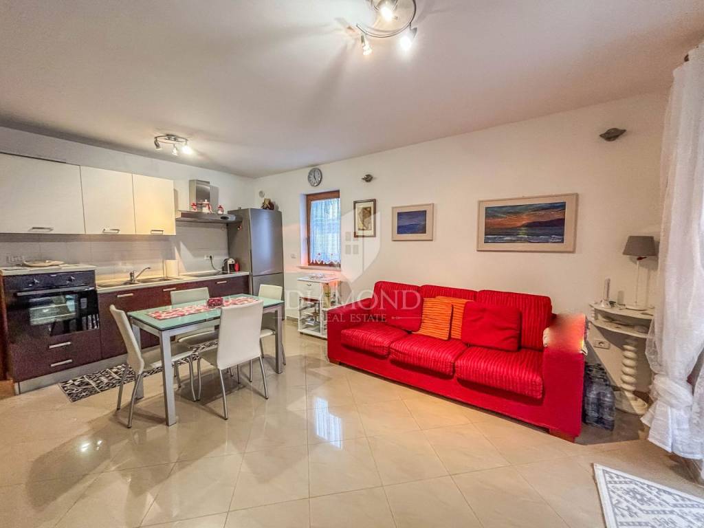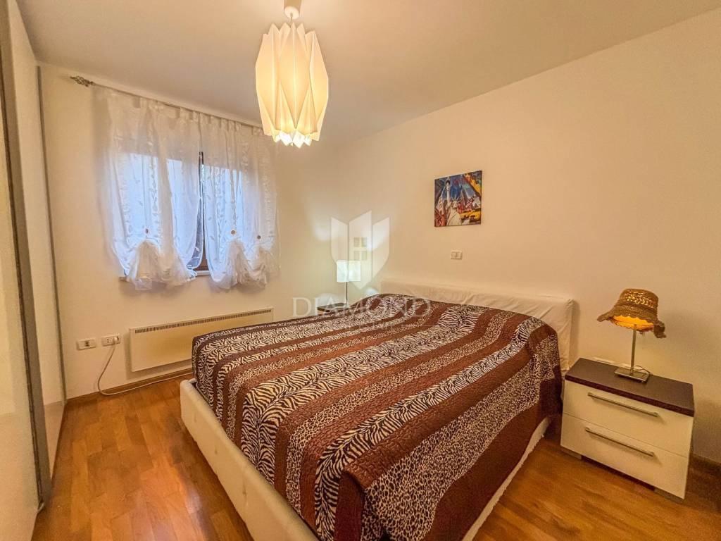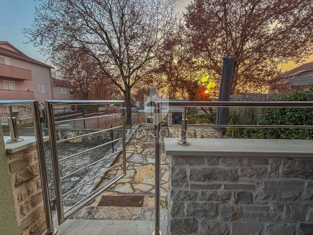 The apartment covers 61 m² and is sold fully furnished, with carefully selected details that give the space a sense of warmth and elegance. It consists of two bedrooms, a comfortable bathroom with a window, a fully equipped kitchen connected to the dining room and a spacious and abundantly lit living room with access to a loggia and a fenced garden. A special value to this property is given by the fenced outdoor area of 30 m² with a barbecue area, which offers a view of the sea and the surrounding greenery, providing a perfect place to relax and socialize. The apartment is oriented to the south, which ensures plenty of natural light and many sunny hours throughout the day. The apartment also comes with its own parking space and storage room on the ground floor of the building.