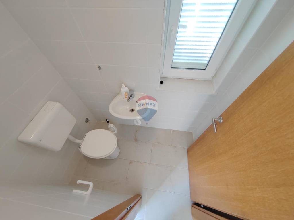 The house consists of a ground floor and an upper floor. On the ground floor there is a bathroom, a kitchen with a dining area and living room, and a terrace with access to the yard and garden. On the upper floor there are two bedrooms, a bathroom and a balcony. The house is equipped with air conditioning and a pellet stove.