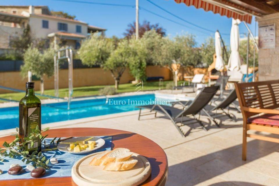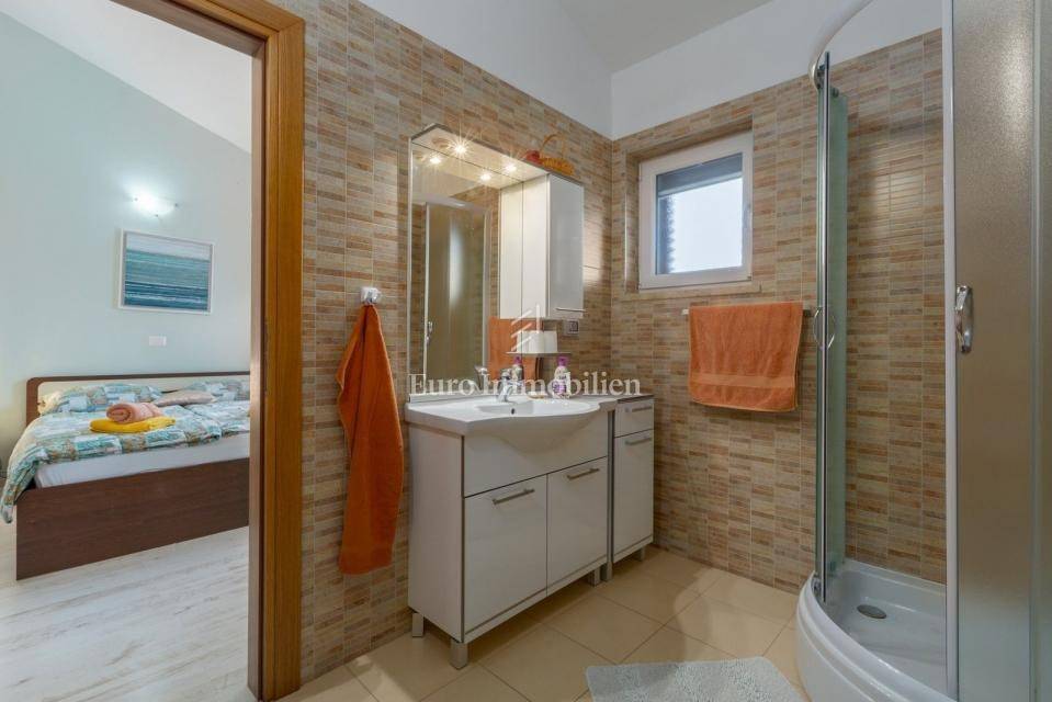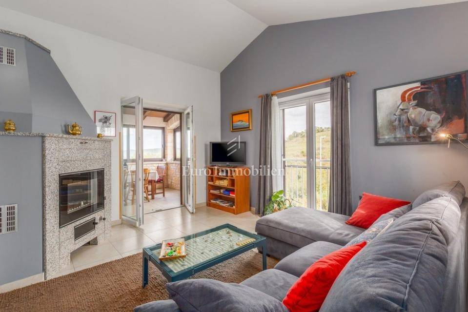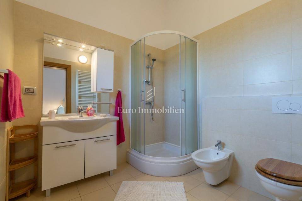 On the ground floor are two bedrooms, a kitchen with dining room, a bathroom and a large storage room. An internal staircase leads to the first floor where there are two further bedrooms each with its own bathroom, entrance hall, toilet + laundry room, kitchen, dining room, living room with fireplace and an enclosed terrace with beautiful unobstructed views to the east. From the living room you have access to the covered terrace on the west side and to the garden. In the garden is a 21 m² swimming pool, a sun deck, a solar shower, a charcoal grill, a lawn with olive trees and other Mediterranean plants. The garden is surrounded by a 2 m high wall, equipped with an irrigation system and an automatic gate to enter the covered parking lot (2 parking spaces).