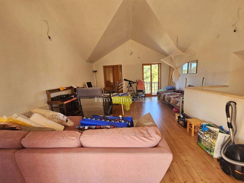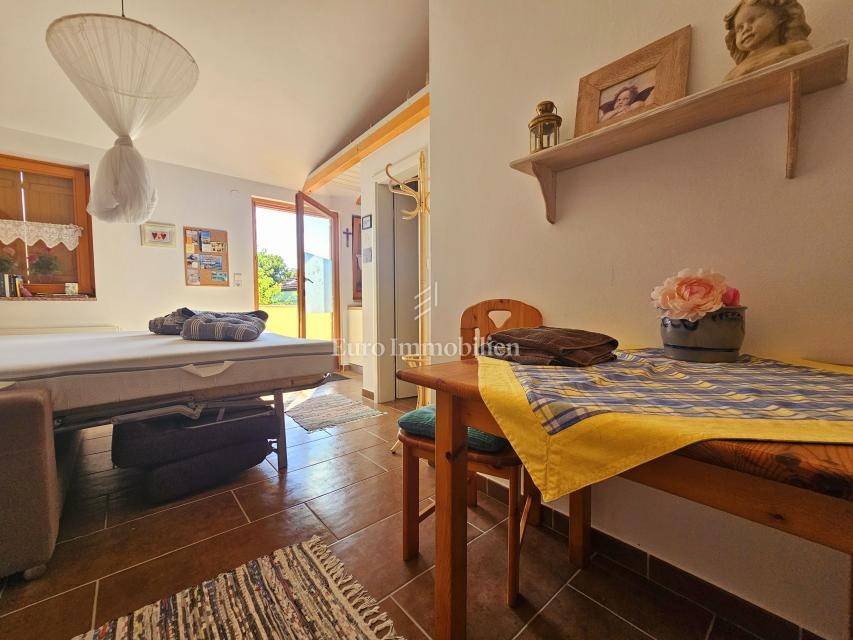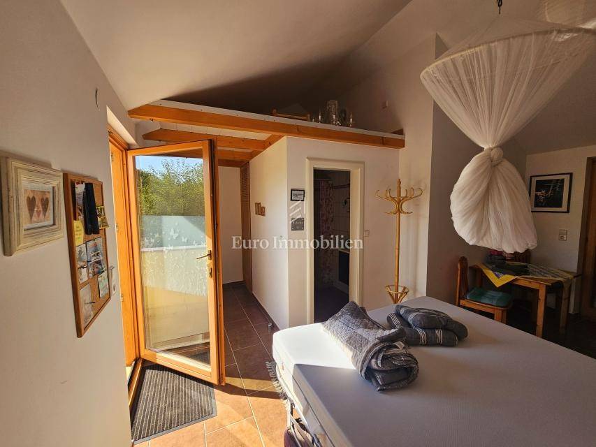 The new building was built in 2015, has an area of approx. 140 m2 and consists of three floors. In this building there is a two-room apartment and a studio apartment, both furnished and equipped. The house has a wood stove and radiators (heat pump).