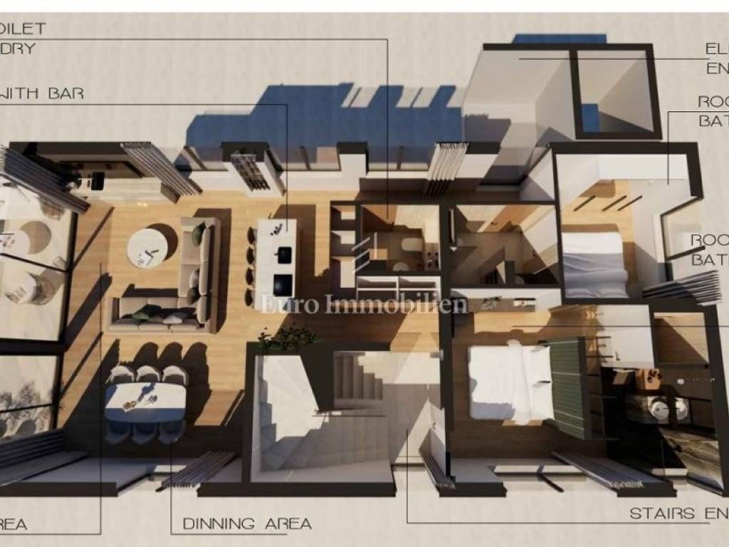 APARTMENT S3 is located on the second floor of a residential building and consists of: staircase, two hallways, living room, kitchen and dining room, study, two bedrooms, two bathrooms, wardrobe, toilet and laundry room, toilet, staircase to the roof terrace , engine rooms.