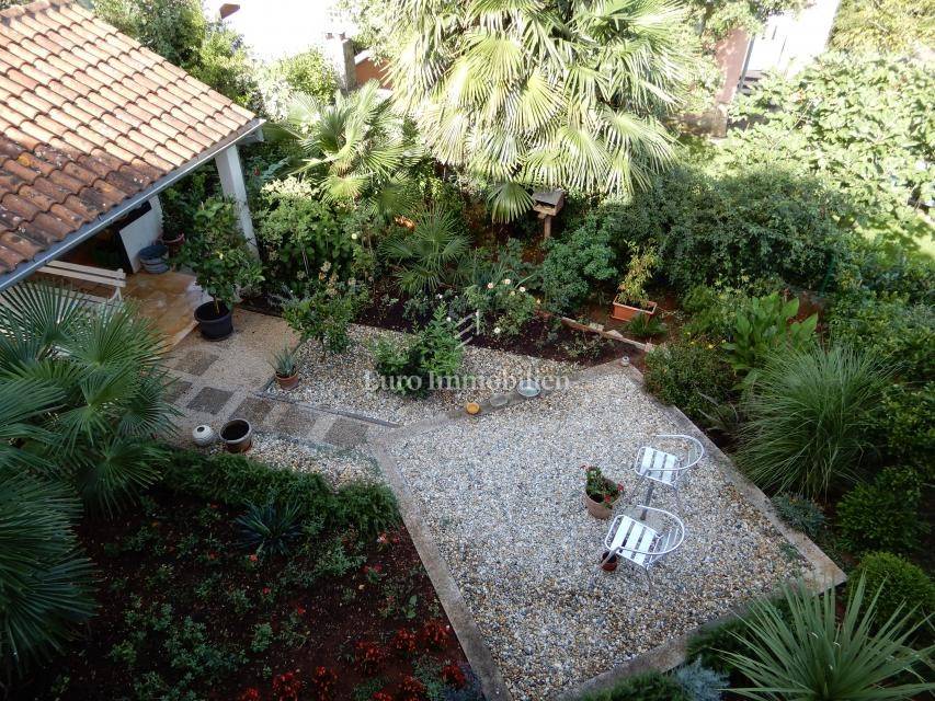 There is a garage next to the house, and a gazebo in the yard. Three parking spaces in the garden.