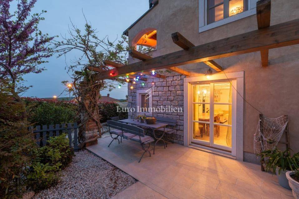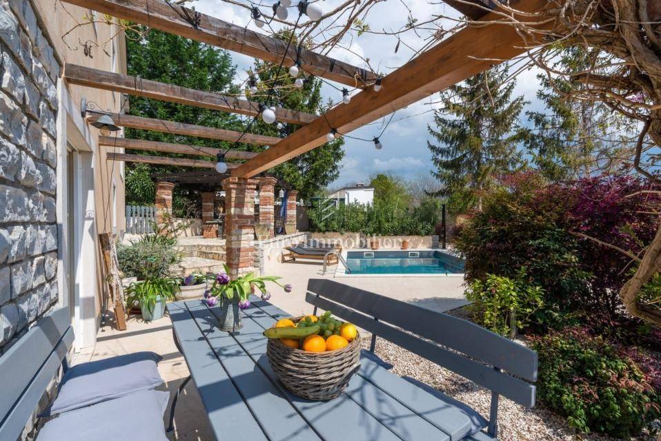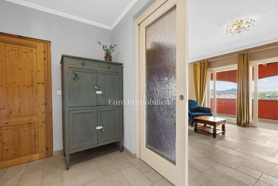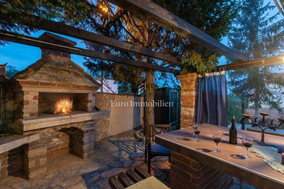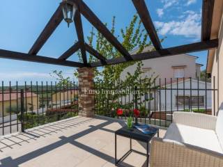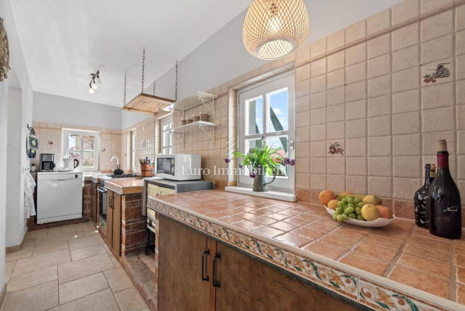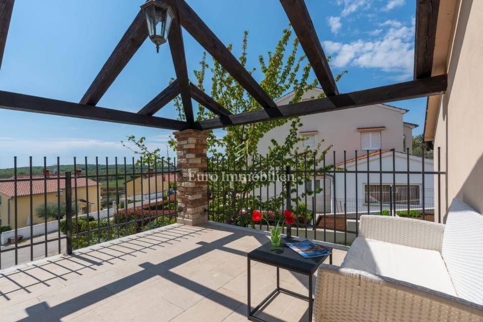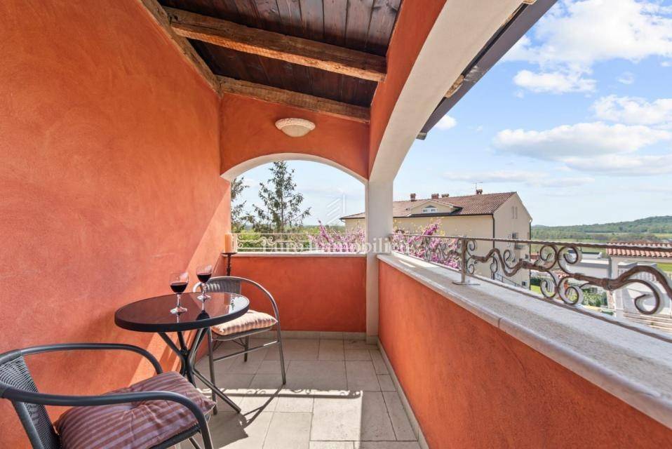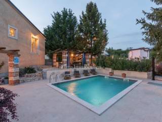 A beautiful villa with a swimming pool is located in a quiet village only 4 km from Poreč and the sea. Located on a fenced plot of 730 m2 with a beautiful landscaped garden in which there is an outdoor pool of 24 m2, a covered terrace with a large table, a fireplace for grilling, an outdoor shower, and two private parking spaces right next to the plot. It consists of the ground floor and the first floor. On the ground floor there is a living room with a fireplace, a dining room and a fully equipped kitchen, a double bedroom with separate beds, two showers/WCs. On the first floor of the house there are a total of three double rooms with double beds, one of which is large with its own terrace, SAT-TV and a sofa, a small kitchen, and a shower/toilet. The terrace offers a beautiful view of the sea. The villa has great potential as a vacation home, and it has an established rental system.