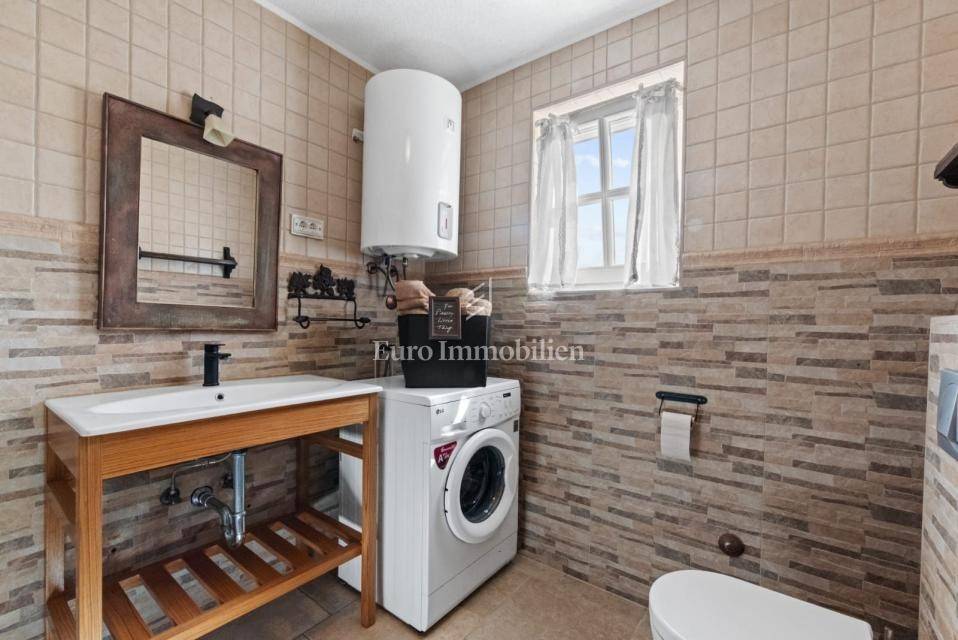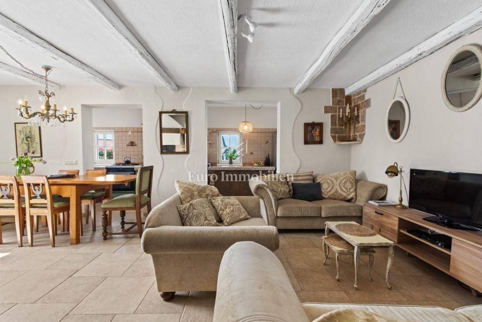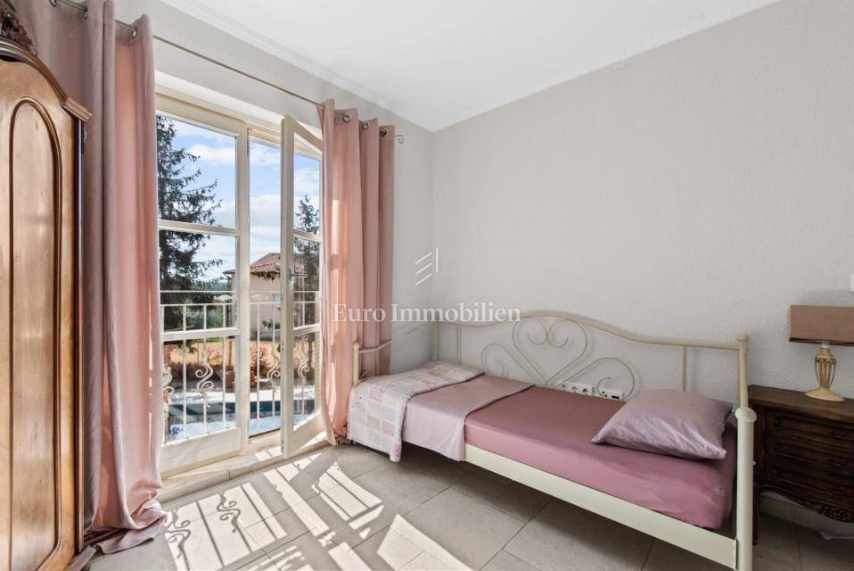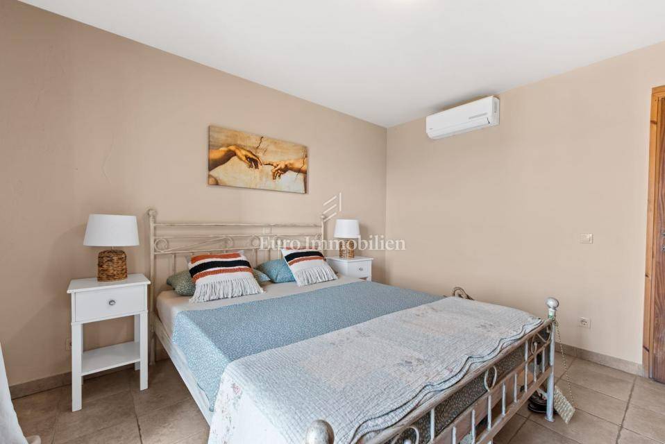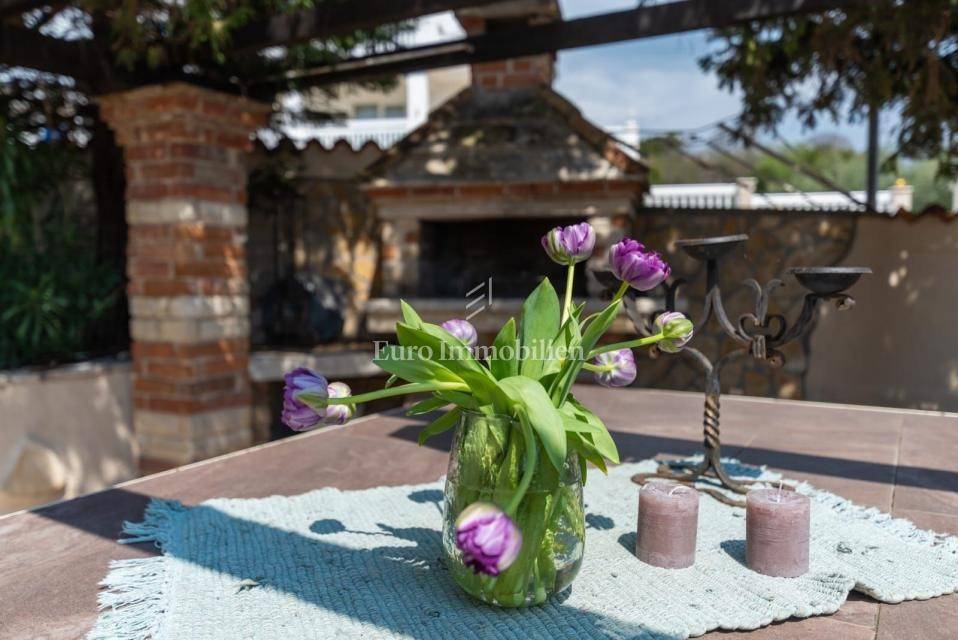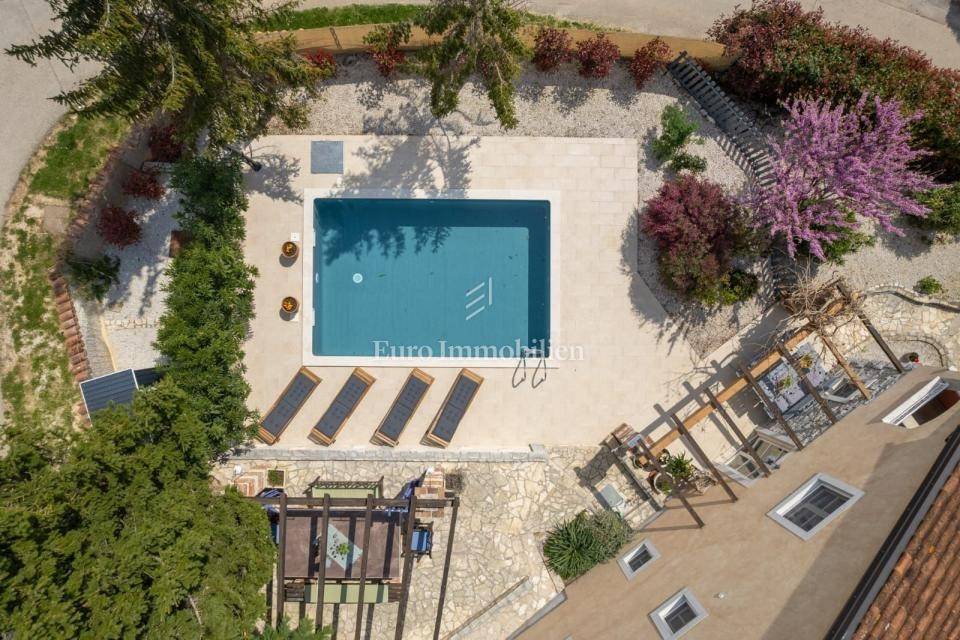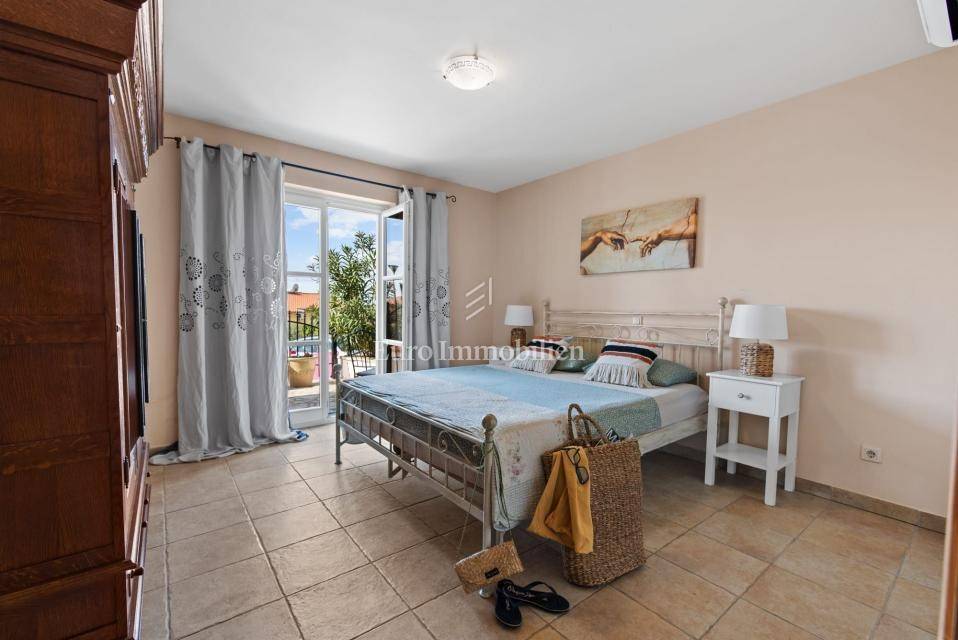 A beautiful villa with a swimming pool is located in a quiet village only 4 km from Poreč and the sea. Located on a fenced plot of 730 m2 with a beautiful landscaped garden in which there is an outdoor pool of 24 m2, a covered terrace with a large table, a fireplace for grilling, an outdoor shower, and two private parking spaces right next to the plot. It consists of the ground floor and the first floor. On the ground floor there is a living room with a fireplace, a dining room and a fully equipped kitchen, a double bedroom with separate beds, two showers/WCs. On the first floor of the house there are a total of three double rooms with double beds, one of which is large with its own terrace, SAT-TV and a sofa, a small kitchen, and a shower/toilet. The terrace offers a beautiful view of the sea. The villa has great potential as a vacation home, and it has an established rental system.