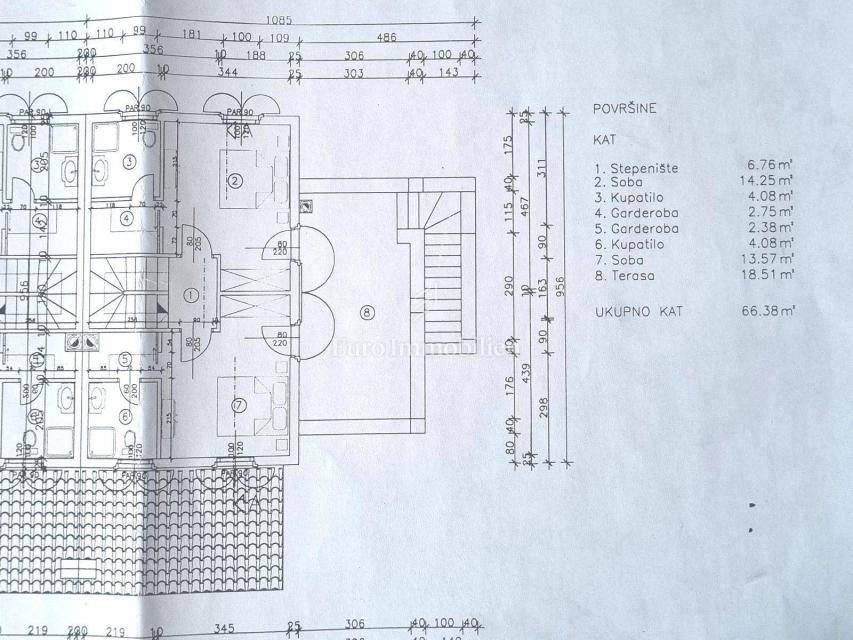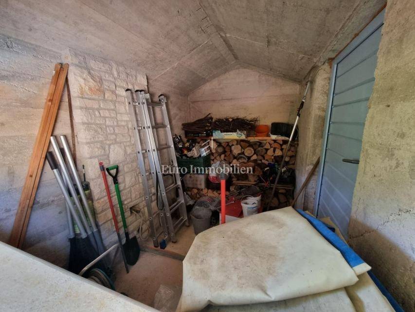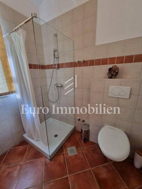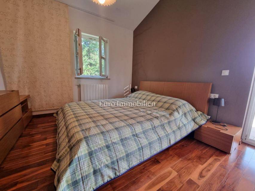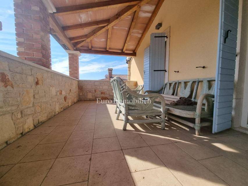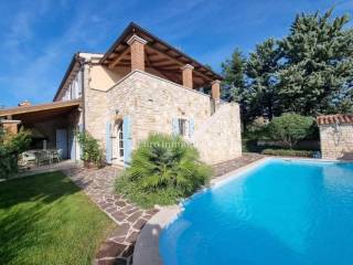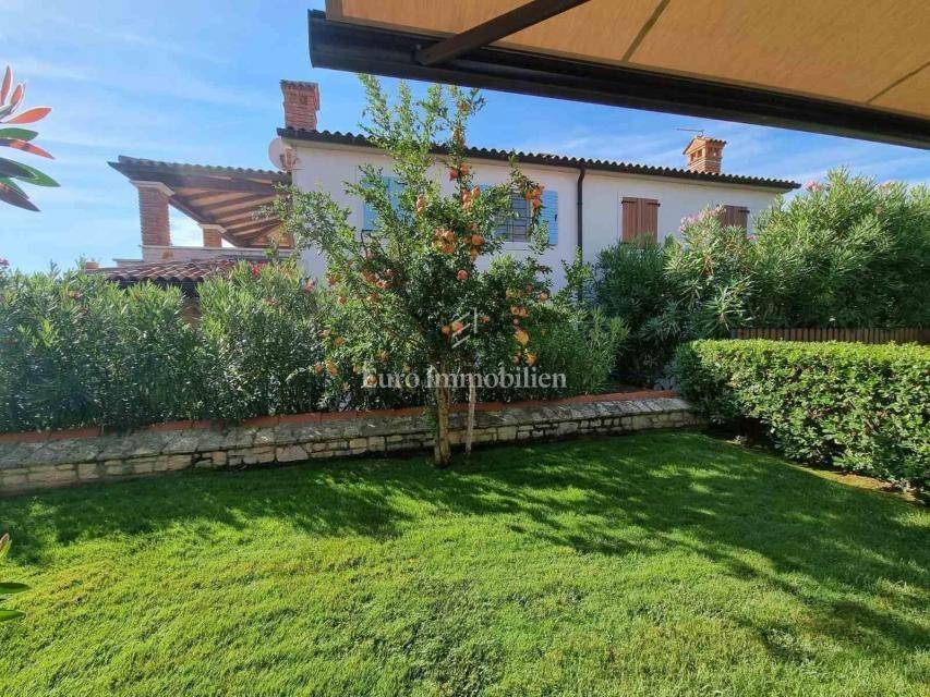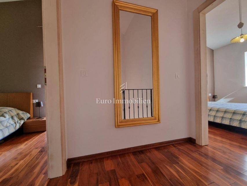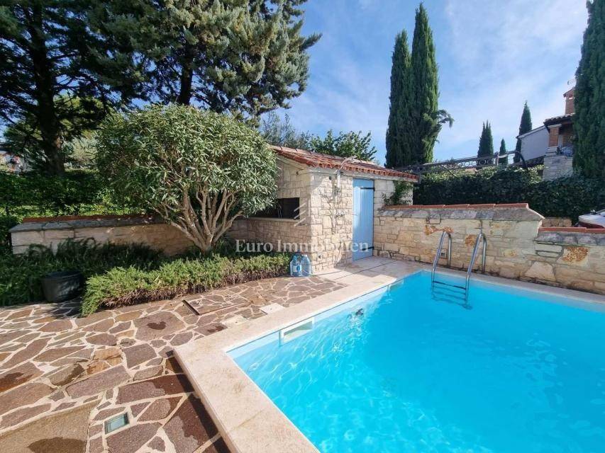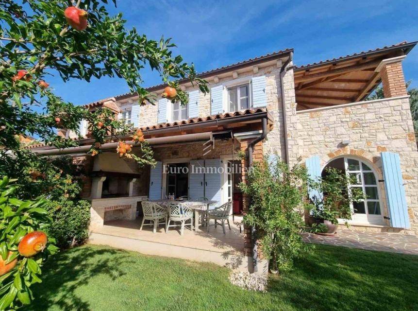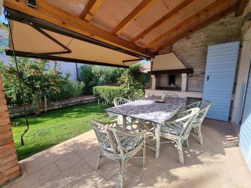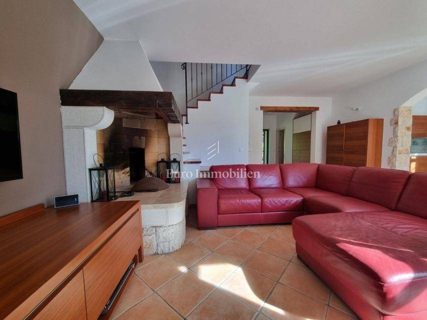Beautiful semi-detached house is located in a quiet location not far from Poreč and only 1 km from the sea. It was built in 2006, and the owners renovated it in 2021, and are continuously maintaining it. They bought it and used it exclusively for their needs, the house has never been rented! It has a total of 155.55 m2 with terraces (135 m2 of closed space), on a plot of 367 m2. The garden has the surface of approx. 200 m2. The house consists of a ground floor and a first floor, it has a Mediterranean-rustic style. On the ground floor there is a hallway, a bedroom, a bathroom, a large living room with a fireplace and a kitchen with a dining room. From the living room and the kitchen there is access to the covered terrace where there is another fireplace and dining table, and to the garden. Upstairs there are two more bedrooms, each with its own bathroom, which share a spacious covered terrace. The terrace is connected to the garden by an external staircase. The garden is beautifully landscaped with Mediterranean plants, an old olive tree, landscaped lawn, and a 30 m2 swimming pool. Next to the pool, a small stone garden house of 7 m2 has been built, where everything is prepared for the sauna or can be used as a storage room. There is an outdoor shower next to the pool and the house. The house has 2 parking spaces. The entire garden is enclosed by a wall, greenery or a metal fence. In the back of the house, near the pool, there is a storage room/boiler room and a summer kitchen. The house is for sale with custom-made furniture for the entire house. The heating is regulated centrally on heating oil. Portable air conditioning is installed only in one bedroom. An alarm and a video camera were also installed. The house can be moved into immediately!