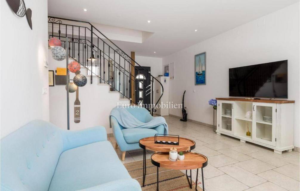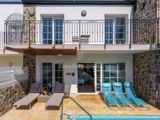 The villa consists of a ground floor and an upper floor where there is a living room with kitchen and dining room, three bedrooms, three bathrooms and a terrace. In front of the villa is a terrace with a sunbathing area and a swimming pool of 20 m2. The entire villa is equipped with underfloor heating and is air-conditioned (multisplit system). The heating and cooling system is connected to the heat pump. The villa has its own storage room and engine room located in the front part of the garden.