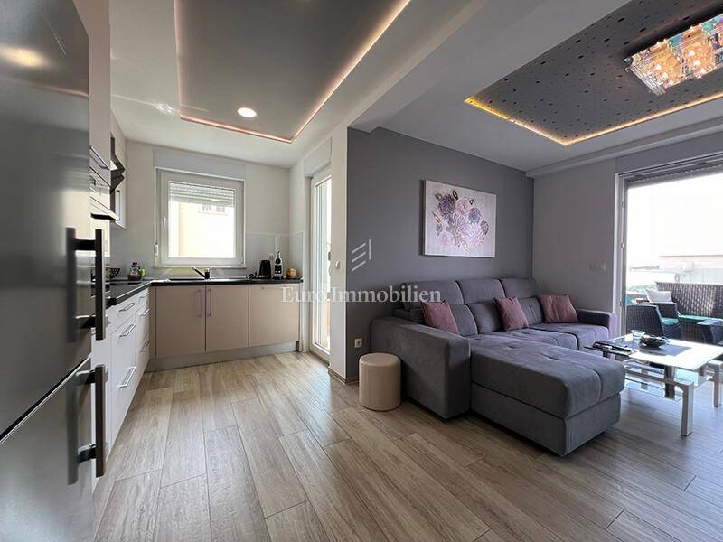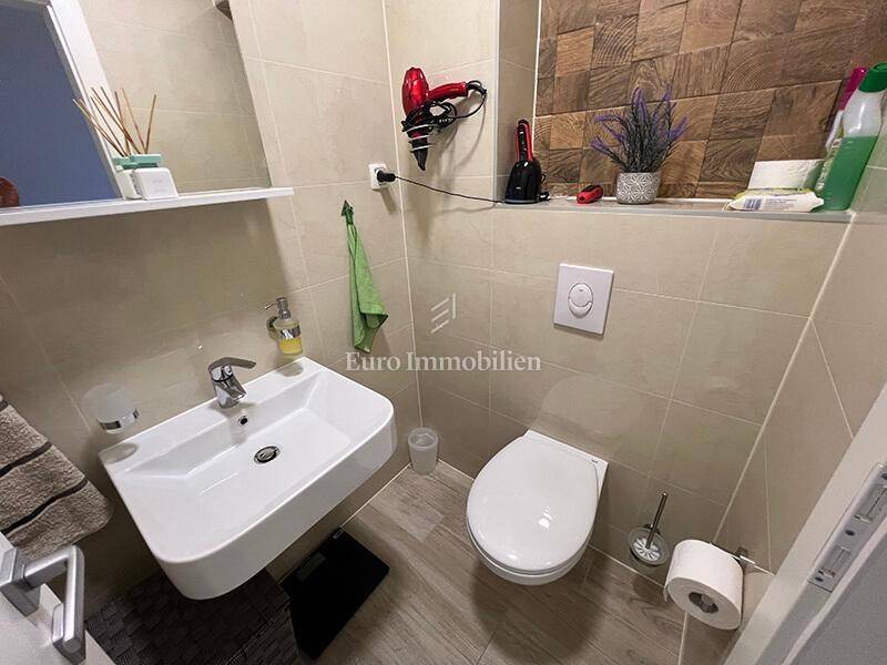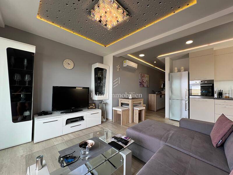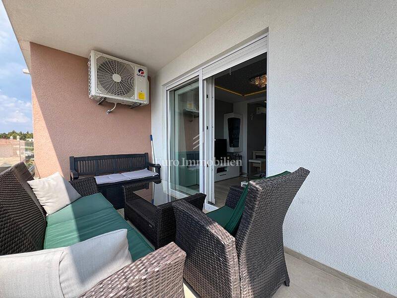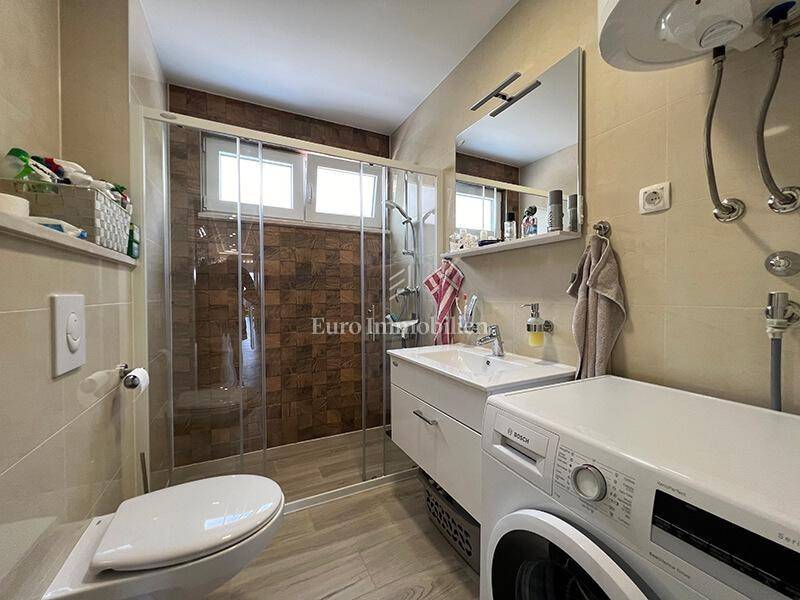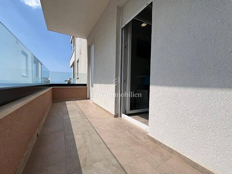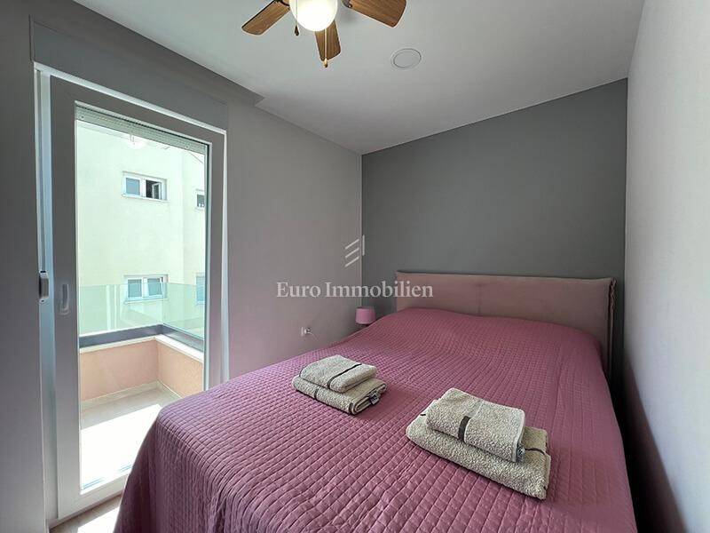 A furnished three-bedroom apartment with a garage and a beautiful view of the sea is for sale near the center of Makarska. The apartment is located on the second floor of a newly built building with a total of 8 apartments. The area of the apartment is 76.85 m2, it consists of three bedrooms, a hallway, a bathroom, a toilet, a kitchen with a dining room, a living room, a balcony of 6.20 m2 and a spacious south-facing loggia of 15.30 m2 from which there is a beautiful sea view. The apartment has rarely been used, it is furnished, equipped with two air conditioners and is being sold as is.