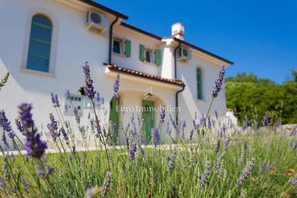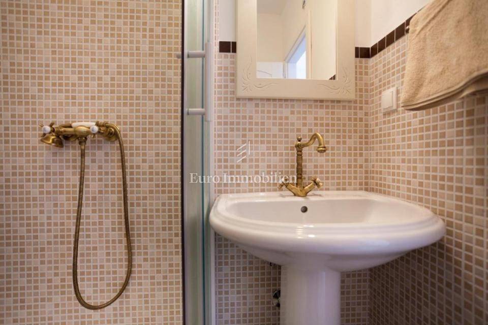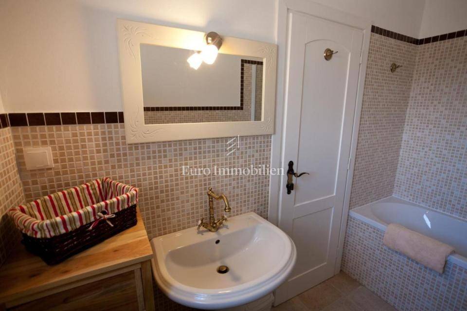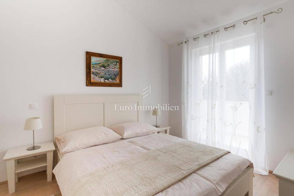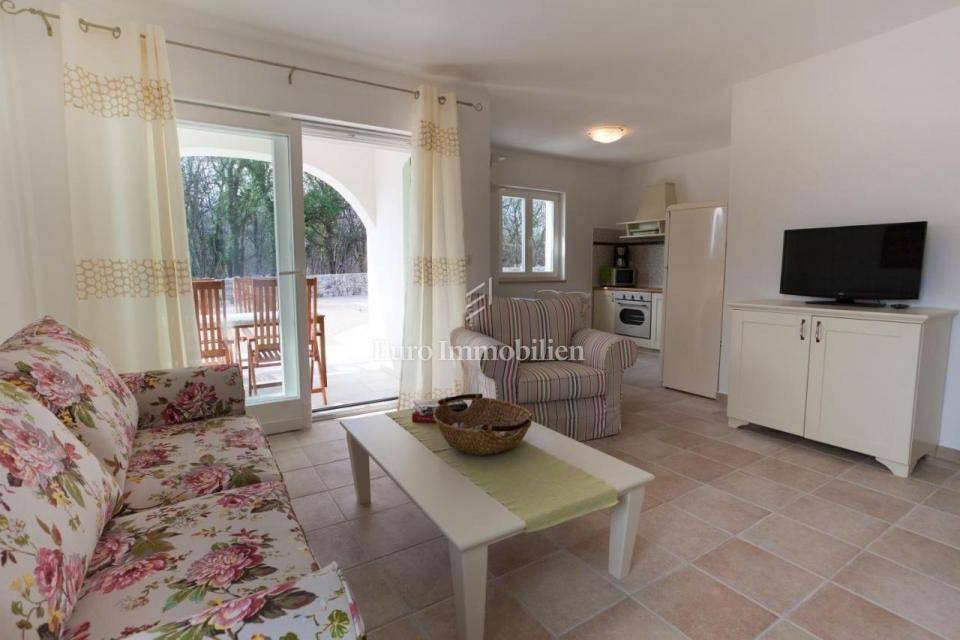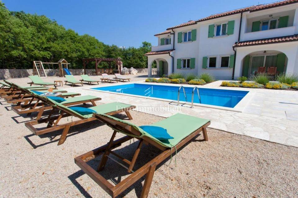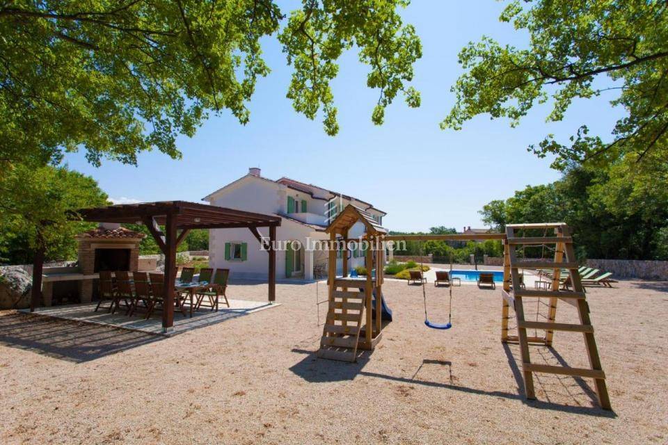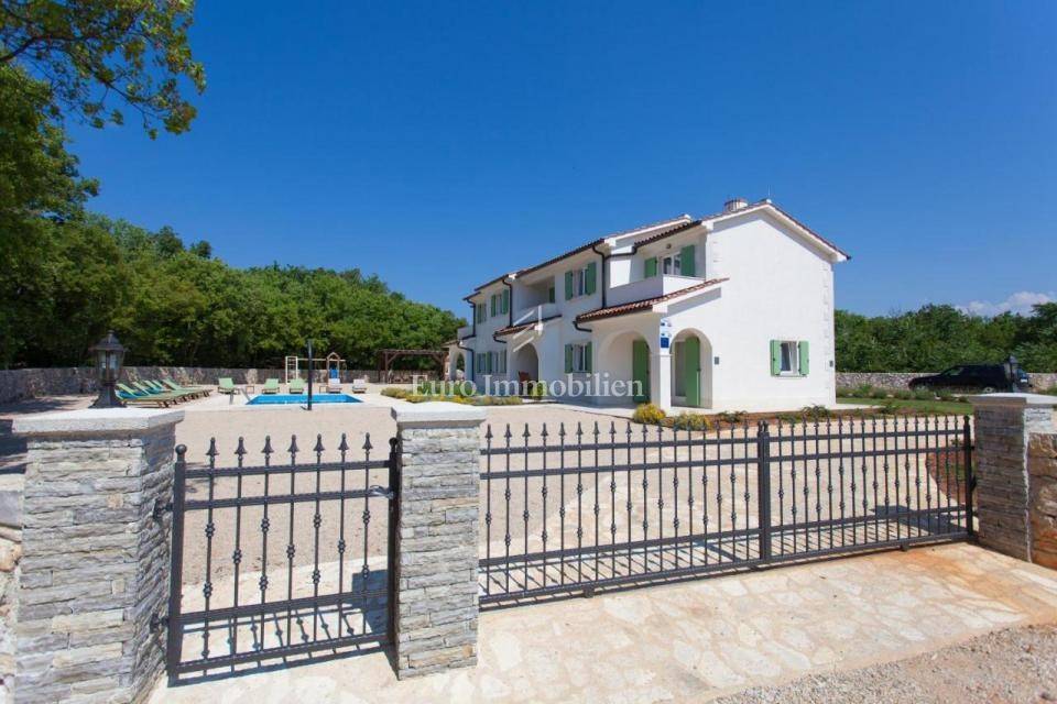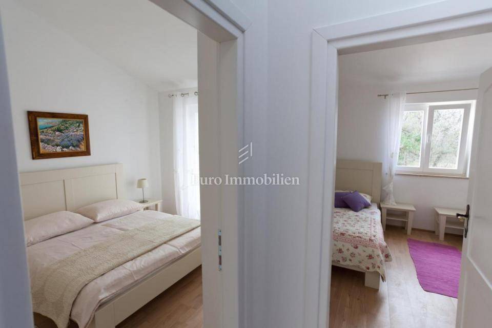 Dobrinj area - a detached house of 232 m2 with three residential units is for sale. It consists of a ground floor and an upper floor, and each unit is designed as a two-story apartment. On the ground floor of each unit there is a living room with a kitchen and dining area, a pantry, a toilet and a terrace, and on the upper floor there are two bedrooms, a bathroom and a terrace. All units are air-conditioned, and heating with a solid fuel fireplace is also possible. The 1734 m2 plot of land is fully landscaped, automatic irrigation has been installed, and the plot has a 45 m2 swimming pool, parking for several vehicles, a children's playground and an area with an outdoor grill. The house is located in a quiet location in the interior of the island, a few minutes' drive from all the important facilities and the sea. The documentation is in order, and the property is suitable for larger families or tourist rental.