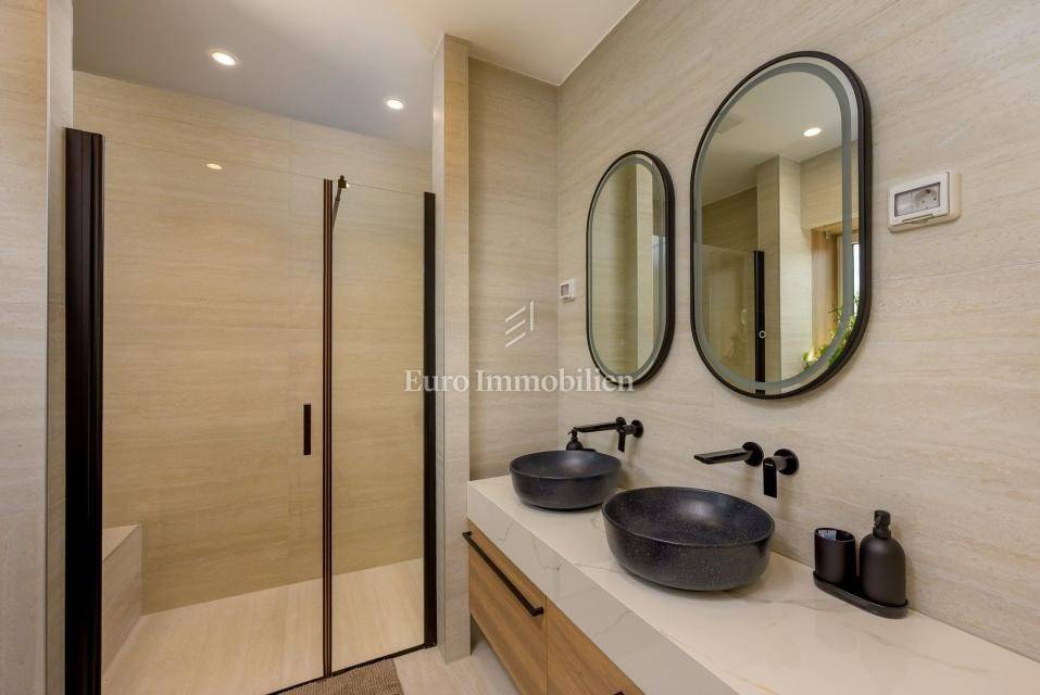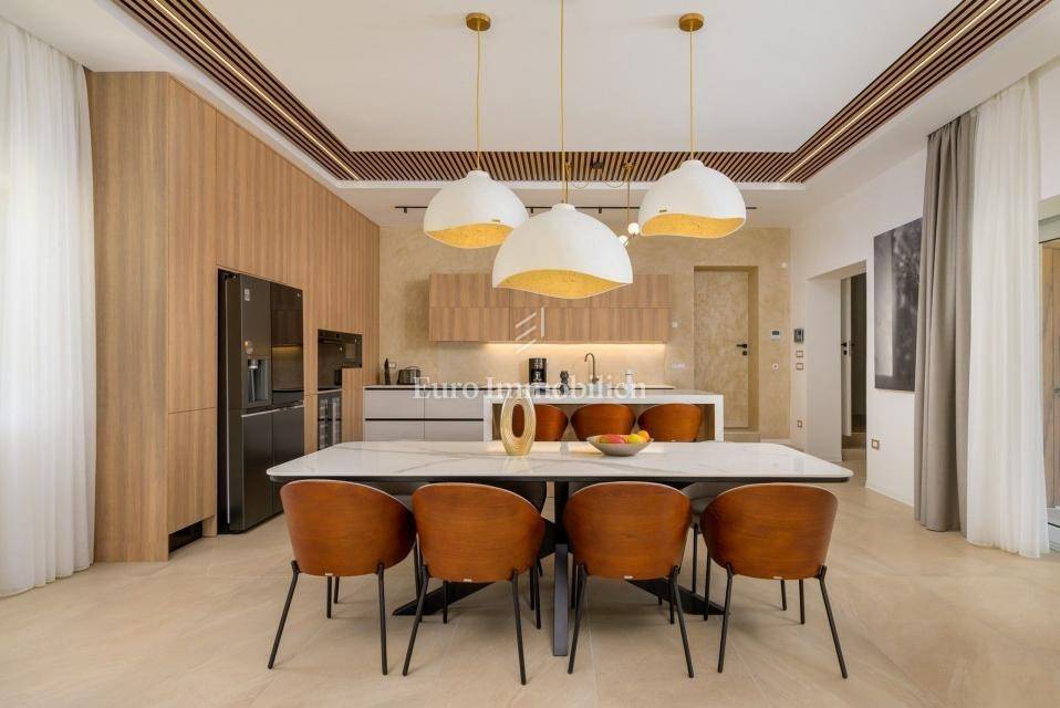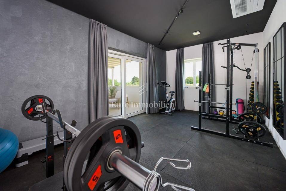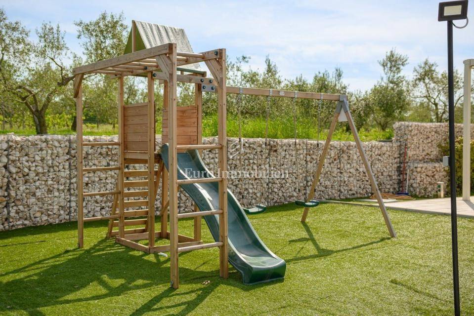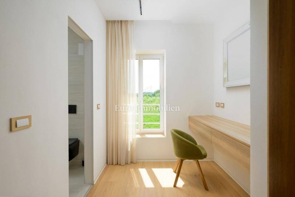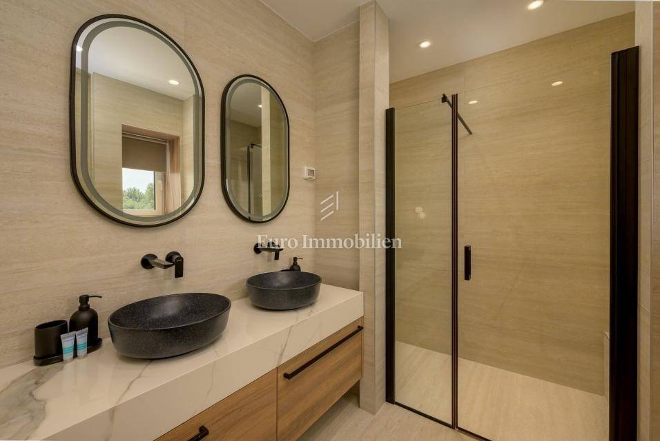On the outskirts of Barban, 11 km from the sea (Trget), stands a detached passive villa on a 1,744 m² plot. The house has 322 m² of living space over two floors. The ground floor includes a living room with kitchen and dining area, hallway, WC, utility room, covered terrace, and two bedrooms each with its own bathroom.