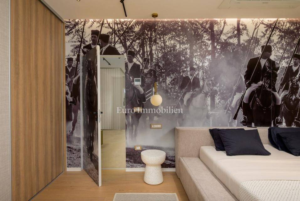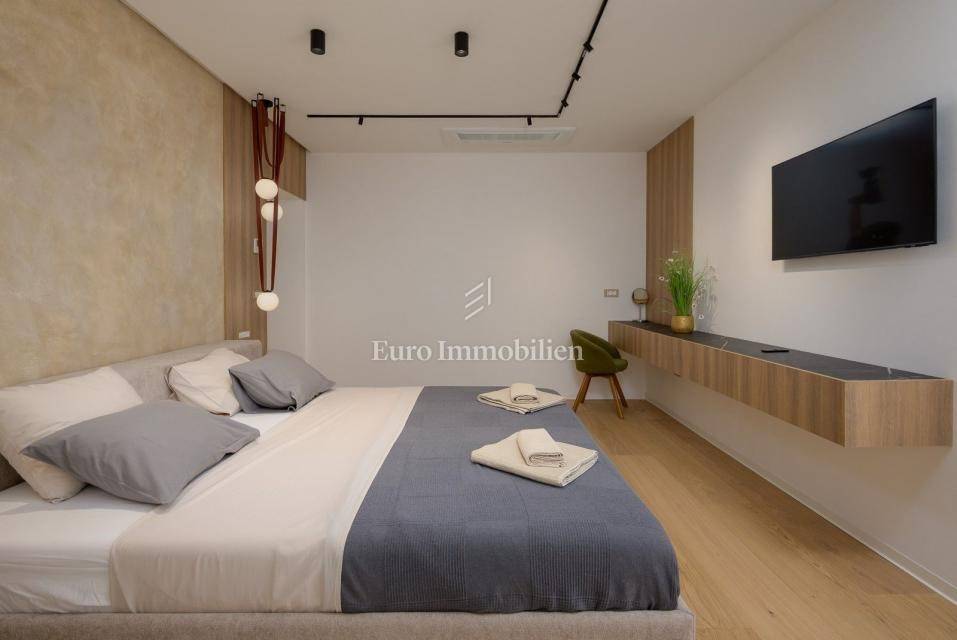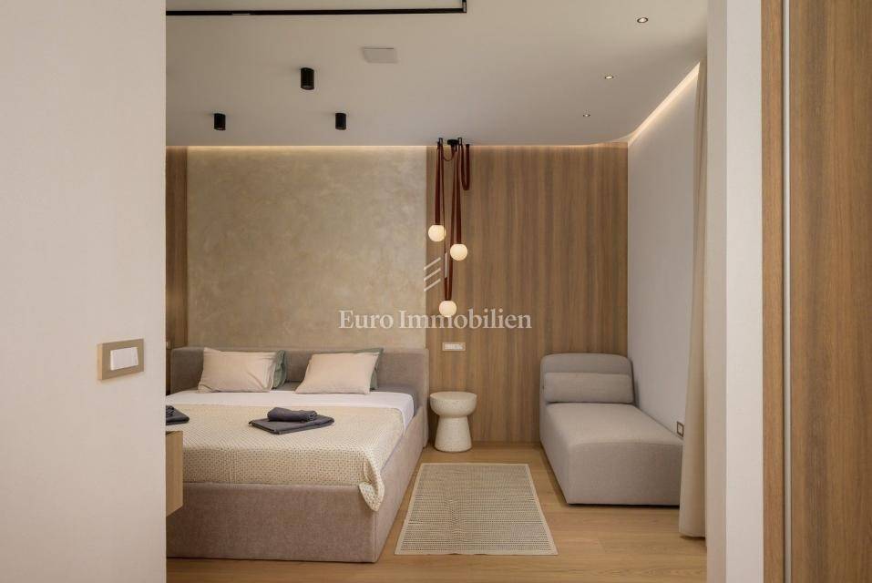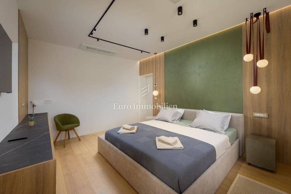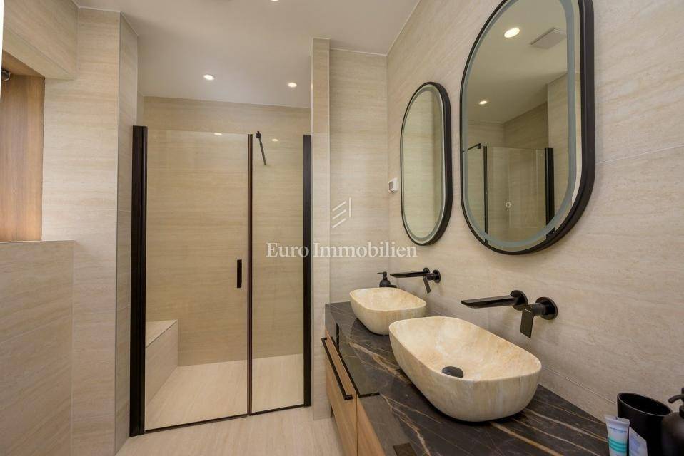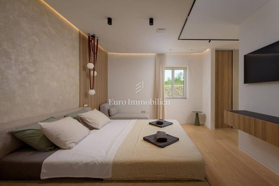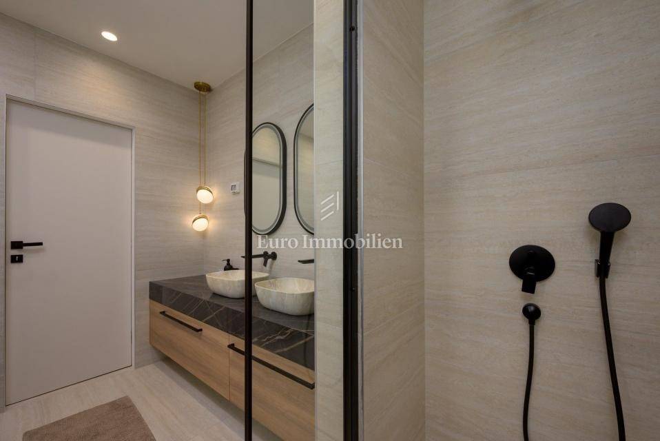 On the outskirts of Barban, 11 km from the sea (Trget), stands a detached passive villa on a 1,744 m² plot. The house has 322 m² of living space over two floors. The ground floor includes a living room with kitchen and dining area, hallway, WC, utility room, covered terrace, and two bedrooms each with its own bathroom.