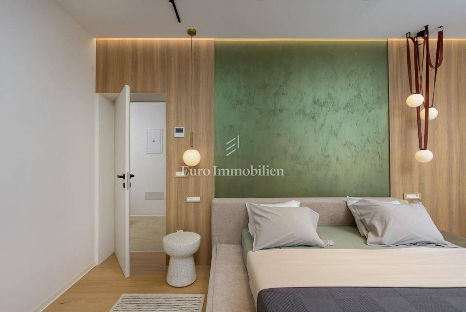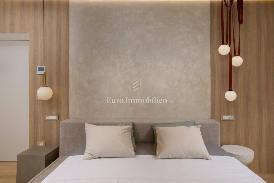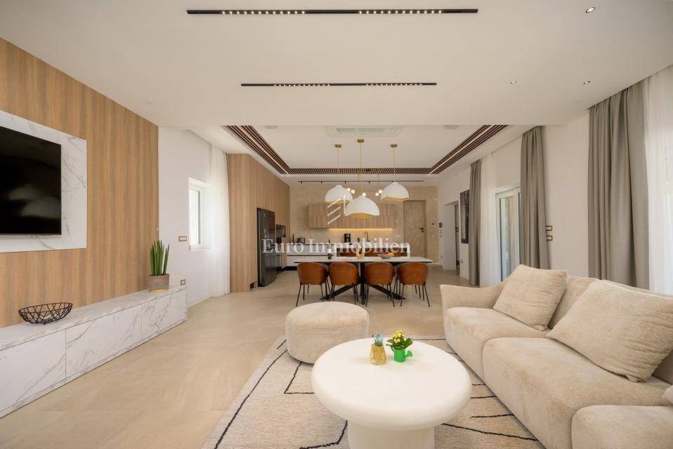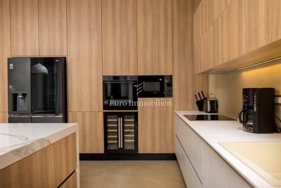 The villa comes with high-quality furnishings, mechanical ventilation in all rooms, Samsung Windfree air conditioning, a Stiebel Eltron heat pump (300 l), and PVC windows. The landscaped garden includes a heated and cooled swimming pool with waterfall, sunbathing area, beach volleyball court, and multiple parking spaces.