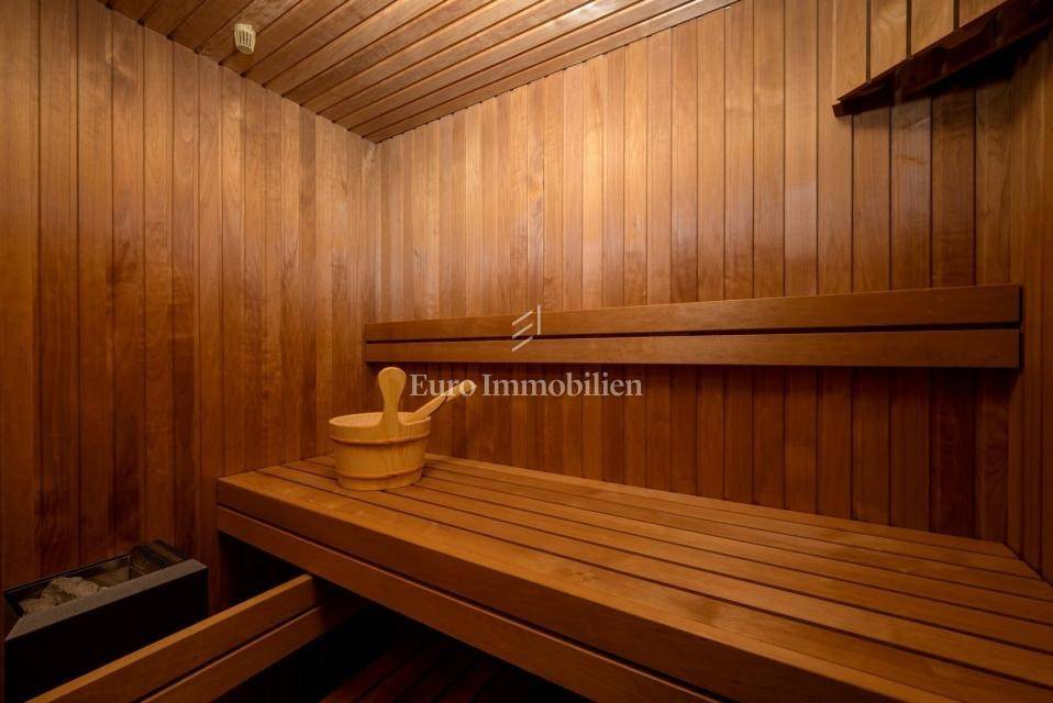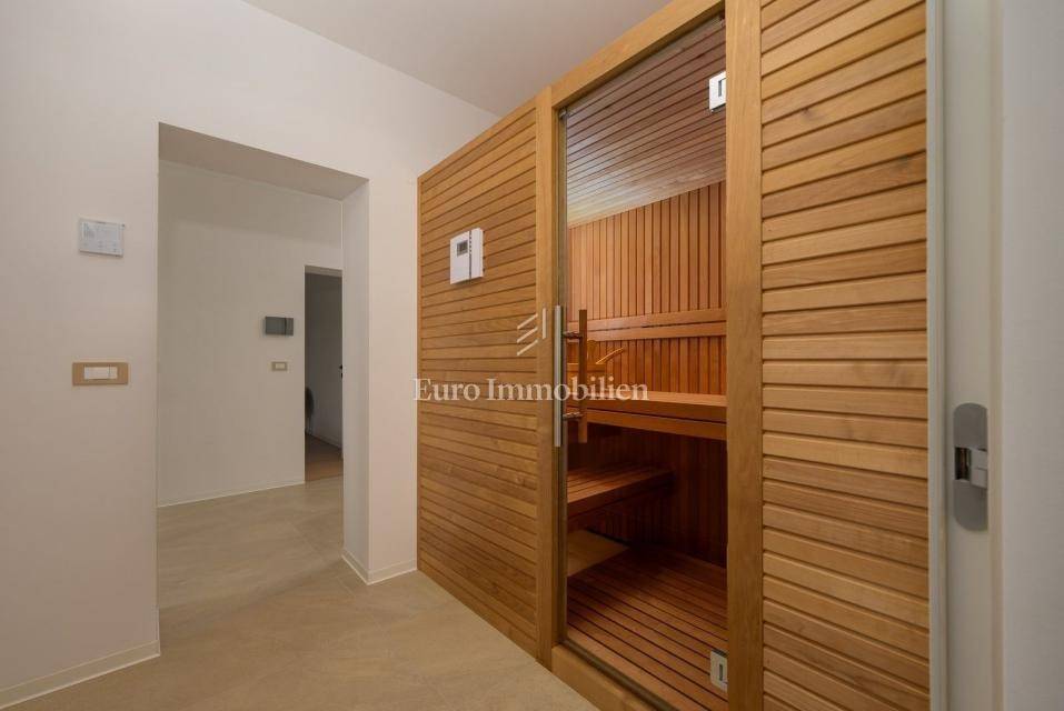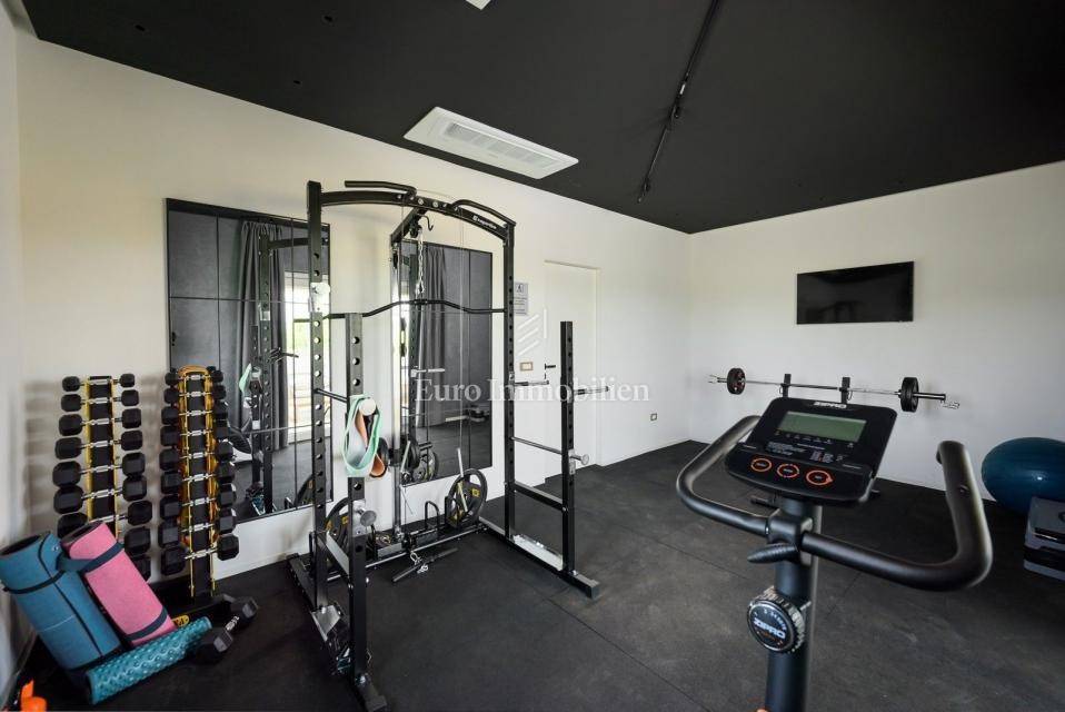 The upper floor features two more bedrooms with bathrooms, a fitness studio with sauna and an additional bathroom, and a terrace with views of the surrounding nature.
