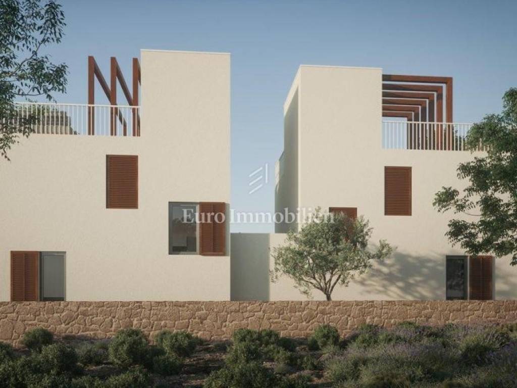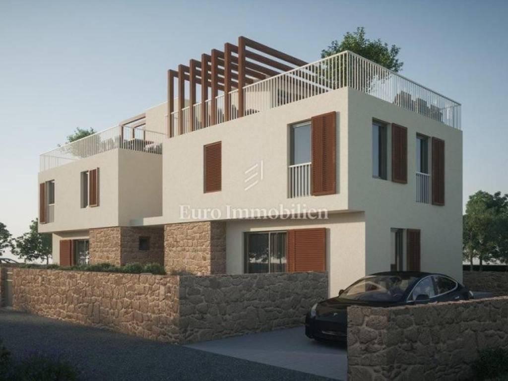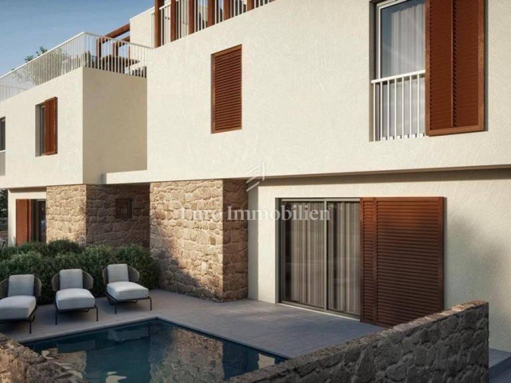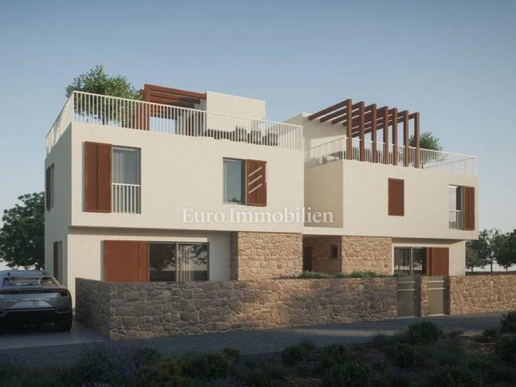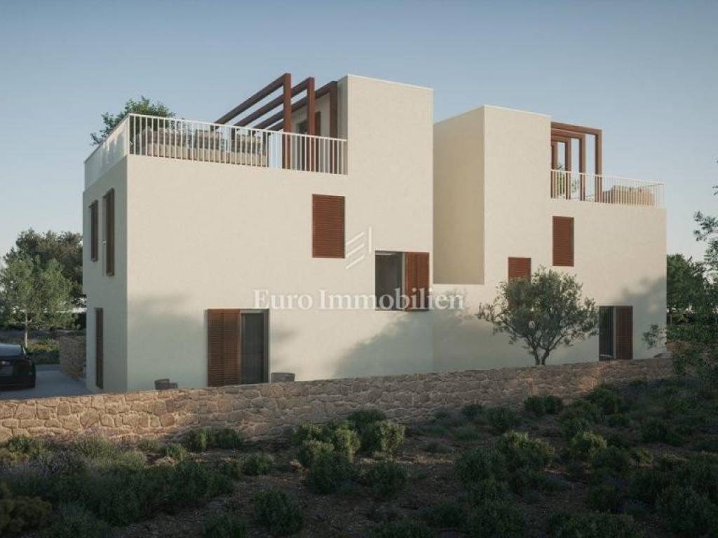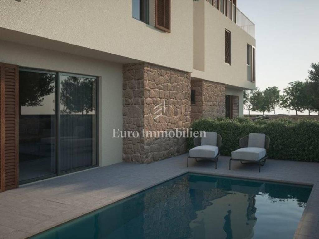 A modern apartment with a pool and a sea view is for sale in a new building in Tribunj.