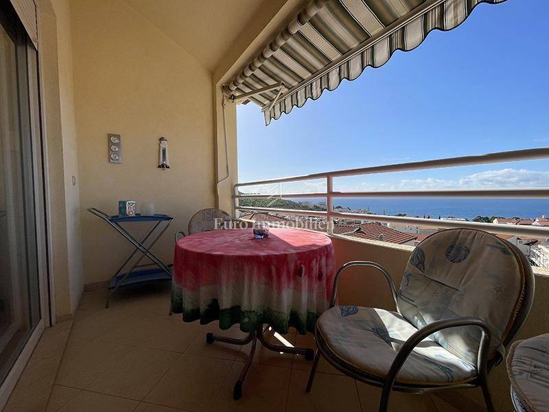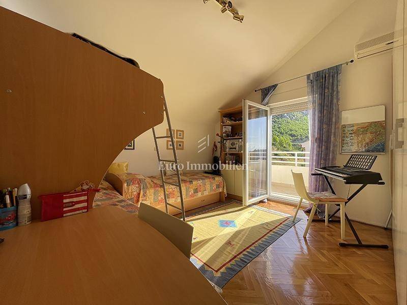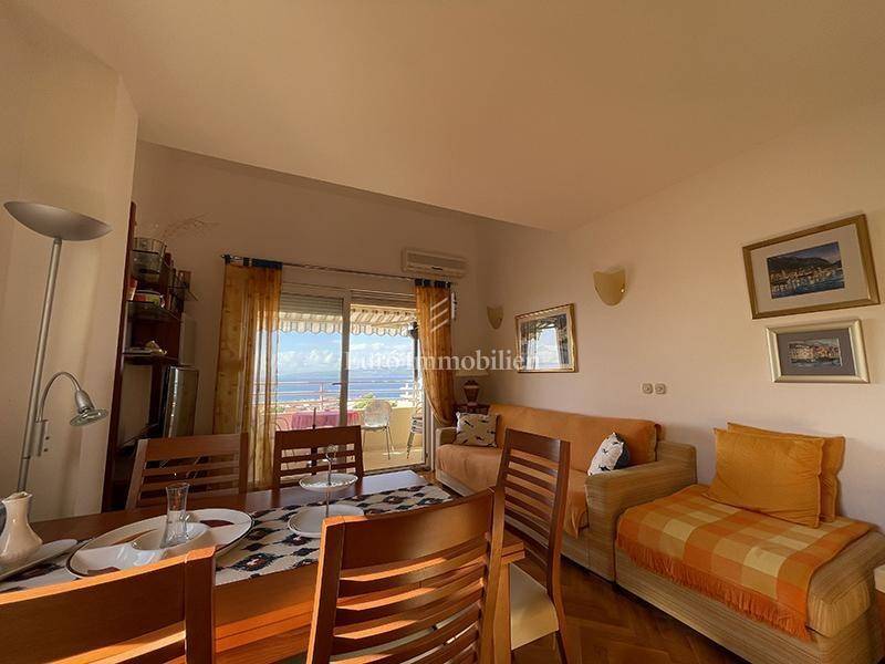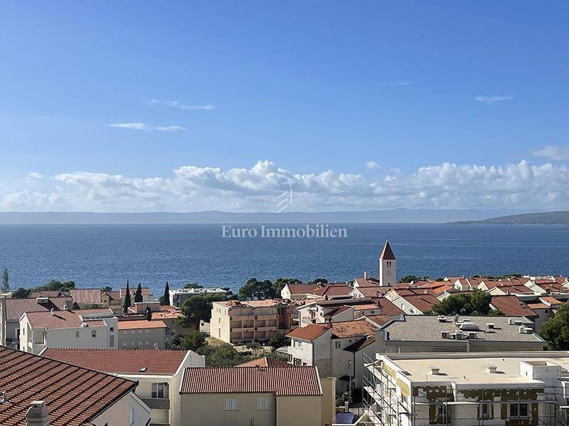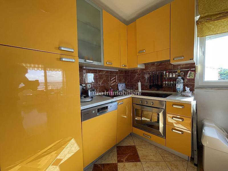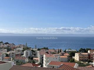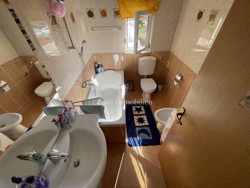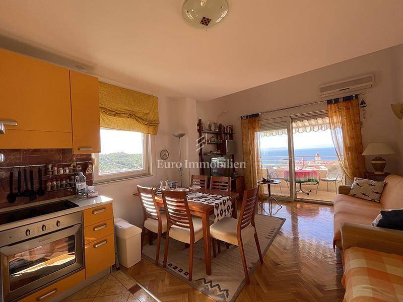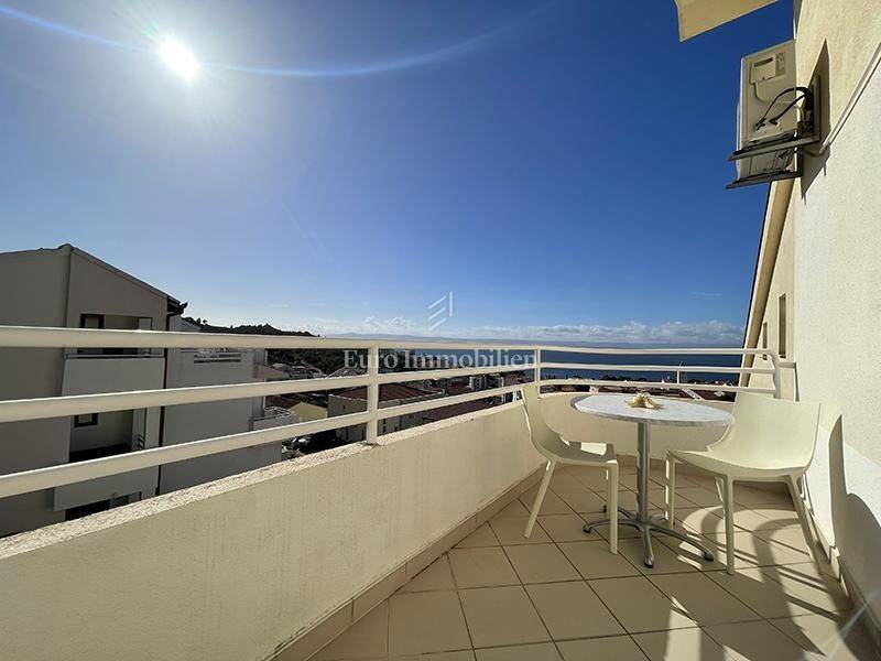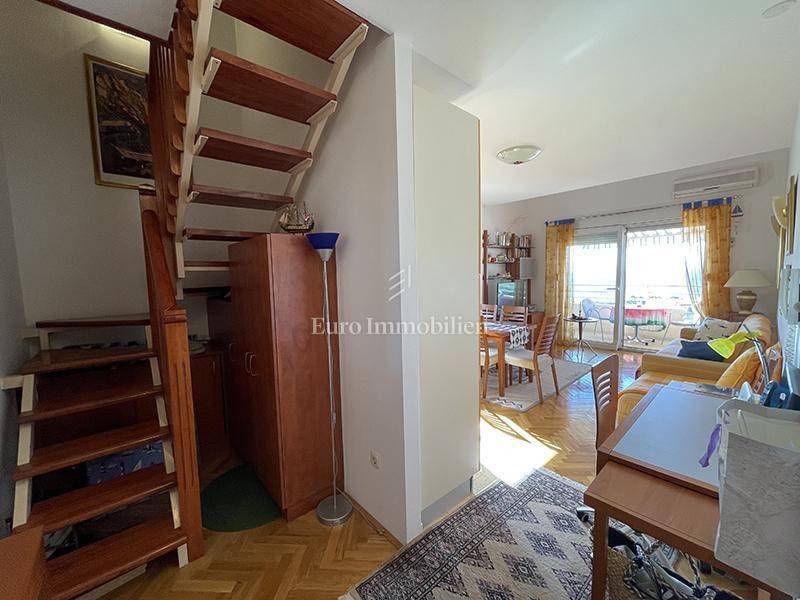 The area of this two-story apartment is 65.52 m2 and it is located on the third floor and attic of the residential building. It consists of a kitchen, dining room and living room, staircase, bathroom, two bedrooms and two balconies. The apartment is south-oriented and has a beautiful panoramic view of the sea from both floors, which is impossible to enclose. The apartment also has a storage room of 3.47 m2 in the basement of the building. It is fully equipped, furnished and air-conditioned, and is for sale as such. One outdoor parking lot is located in front of the building.