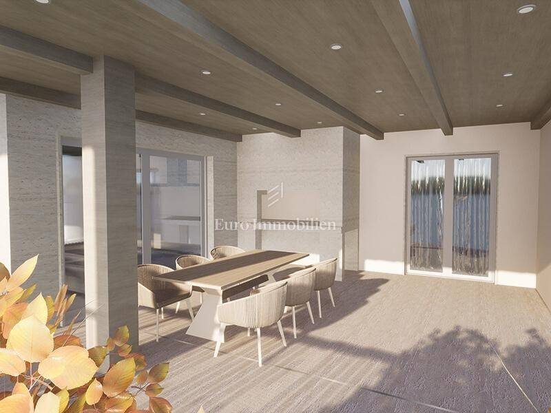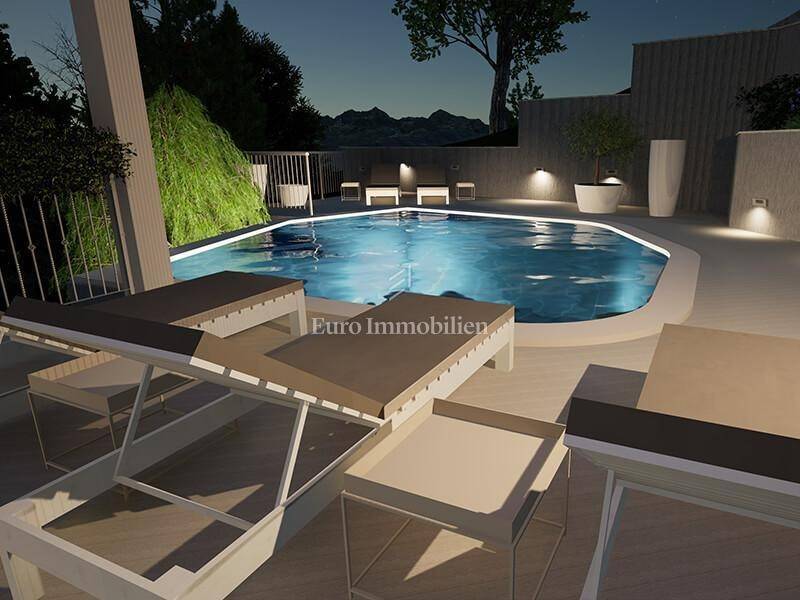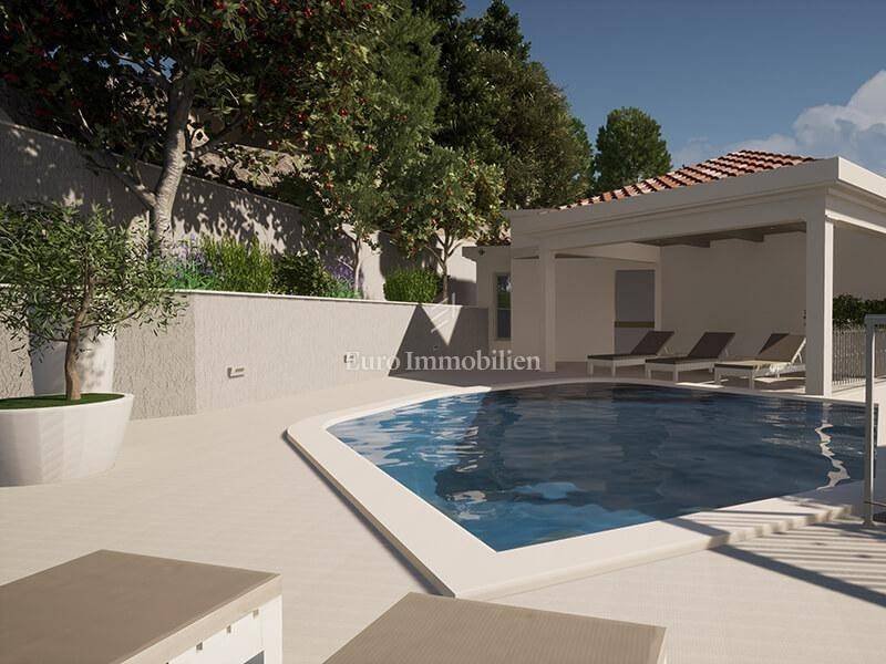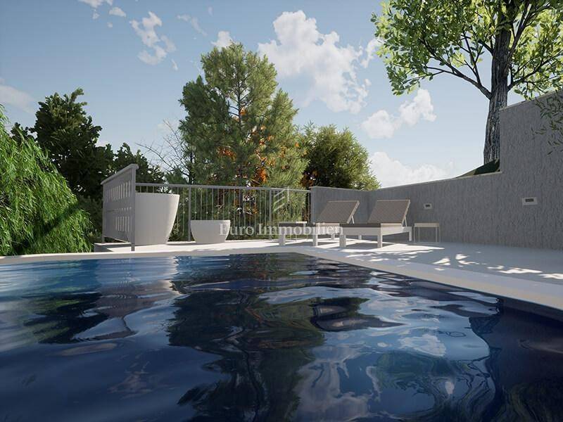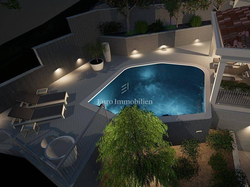 The detached house with an area of 288 m2 extends over the basement, ground floor and first floor, and the land area is 621 m2. In the basement there is a garage for two to three vehicles, a wine cellar of approx. 30 m2, a storage room of approx. 15 m2, an elevator that goes from the garage to the upper floors, an internal staircase to the upper floors. Another outdoor parking space is provided in front of the building. On the ground floor of this luxury villa, there is a kitchen, dining room and living room, bathroom, storage room, technical room, anteroom and a multi-purpose room that can be a sauna, jacuzzi, wellness, fitness or similar, a spacious room with a bathroom and a covered terrace with an outdoor grill. The first floor consists of two large bedrooms with en-suite bathrooms and south-facing terraces that offer a beautiful view of the sea that cannot be obscured. On this floor there is also an outdoor pool of approx. 35 m2, next to which there is a spacious covered terrace. The interior layout of the villa is modern with large windows, and every corner of the house offers a fantastic panoramic view of the sea, islands and Baška Voda. At this stage of construction, the customer has the opportunity to choose materials and finishing details.