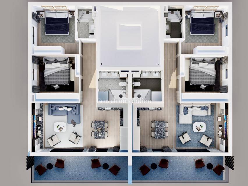 The details of the interior are carefully planned, and during the construction, quality materials and equipment are used, such as high-quality sound and thermal insulation of the building, natural travertine facade, large openings, glass fences without edges on the terraces, high-quality three-layer parquet is installed in all rooms - Croatian production, each room, as well as the living room, has its own air conditioner, LED lighting, the bathrooms are fully equipped and underfloor heating is installed, benches are installed in the shower cabins, and first-class Italian tiles are installed in the bathrooms and on the terraces. An anti-burglary door will be installed at the entrance. It is possible to purchase an outdoor parking space.