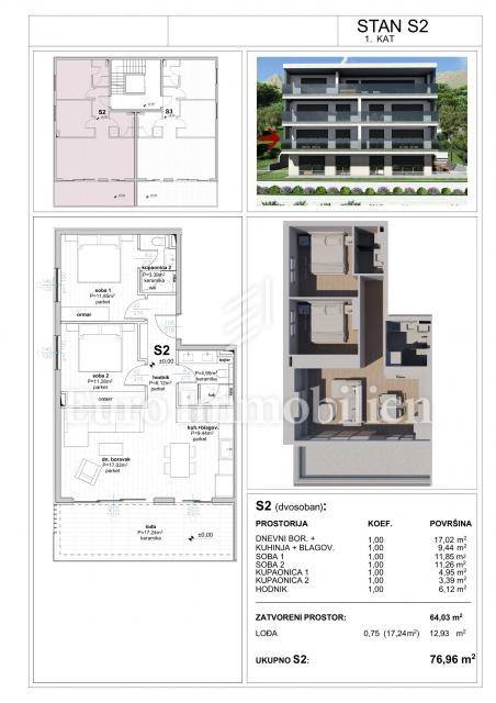 Apartment S2 with an area of 76.66 m2 occupies half of the first floor. It consists of two bedrooms, two bathrooms, hallway, kitchen, dining room, living room and a spacious loggia of 17.24 m2. The apartment has an open concept interior design where the kitchen, living room and terrace form a unique unit, so the sea view is visible from most of the apartment. The view of the sea from this apartment cannot be enclosed, considering that it overlooks already built buildings.