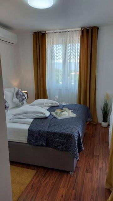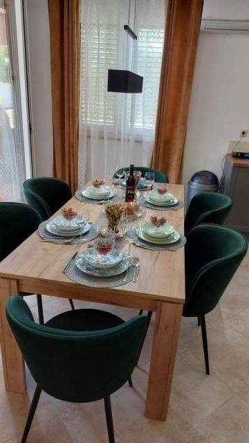 The house with a total living area of 154 m2 extends over the ground floor and first floor. On the ground floor there is a kitchen with a dining room, a living room, a bedroom, a bathroom and a storage room. On the first floor, a bathroom and two bedrooms with access to the terrace. Air conditioners are used for heating and cooling, but the first stage for central heating is also installed. The area of the garden is 1,200 m2. The price of the house includes a building permit for the construction of another identical house with a 7 x 4 m pool, for which all utility and water contributions have been paid.