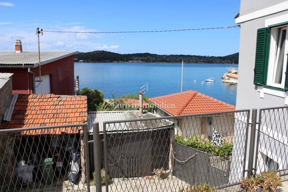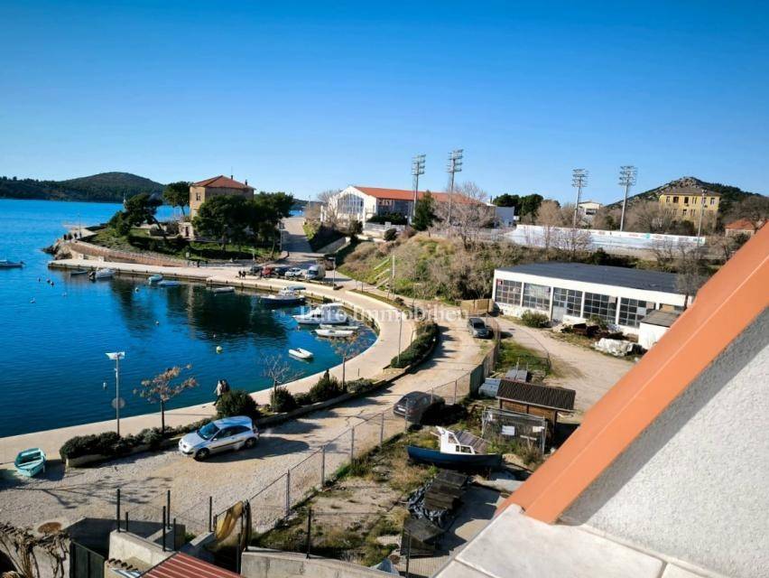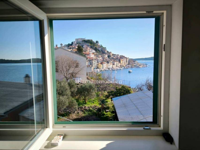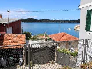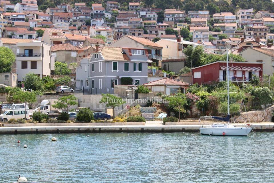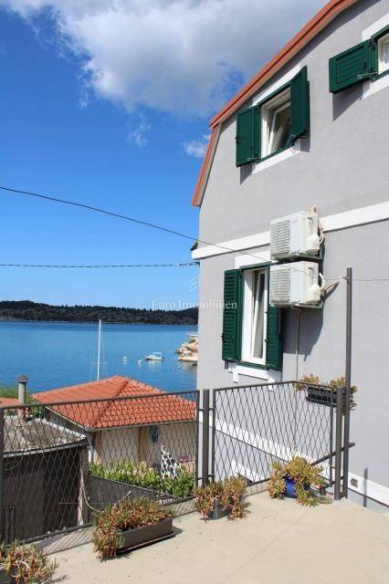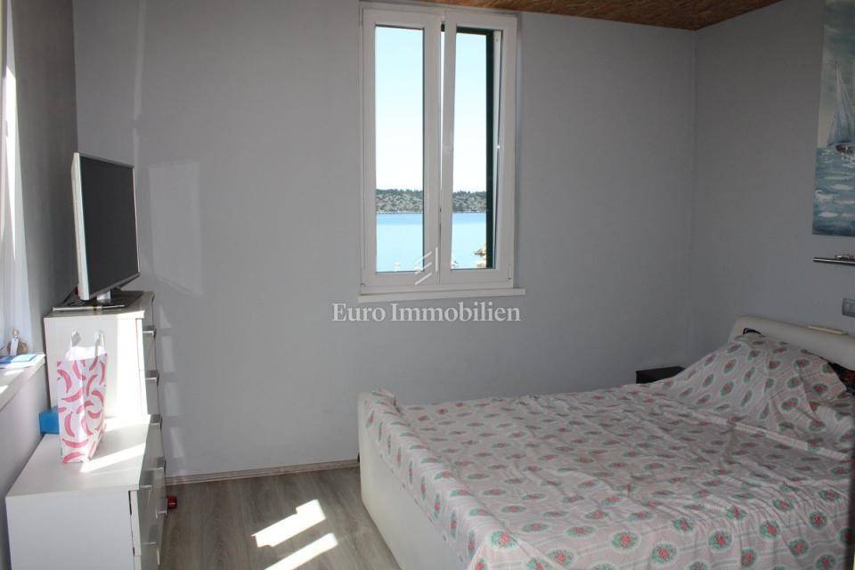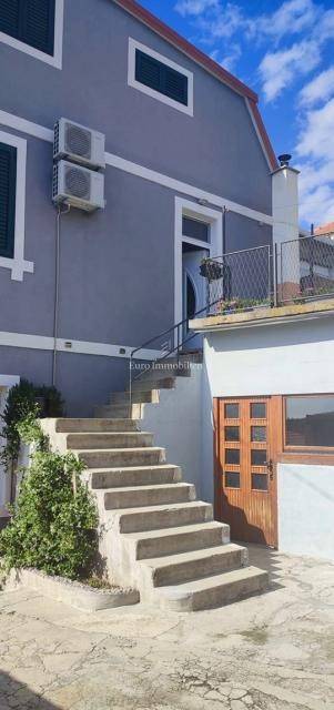 Semi-detached house for sale near Banj beach in Šibenik. The house extends over the ground floor, first floor and attic. It is divided into two apartments, each with 50 m2. The ground floor of the house and the auxiliary building form one apartment, and have a separate entrance. It consists of a living room, dining room, kitchen, bathroom and bedroom. External stairs lead to the apartment on the first floor, where there is a bedroom and a bathroom. Internal stairs lead to the attic where there is a large kitchen and living room with a beautiful view of the sea and Banj beach. The house has a yard, a terrace, and additional auxiliary facilities. The yard can be accessed by car. It has one parking space.