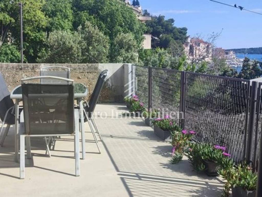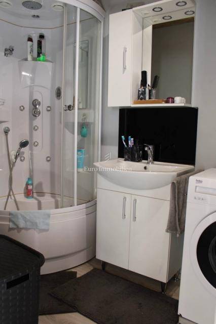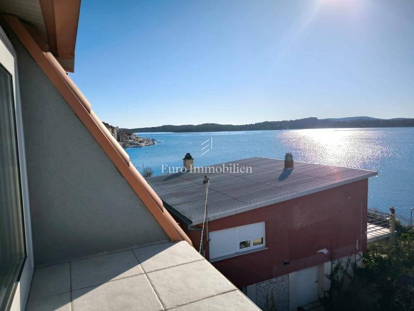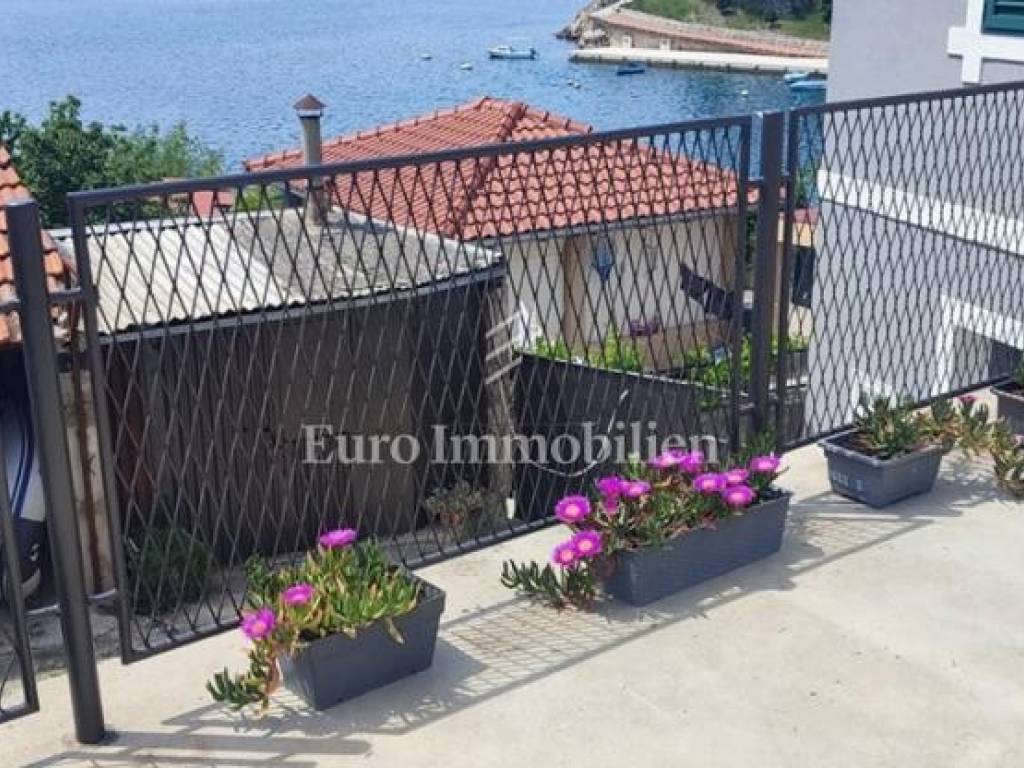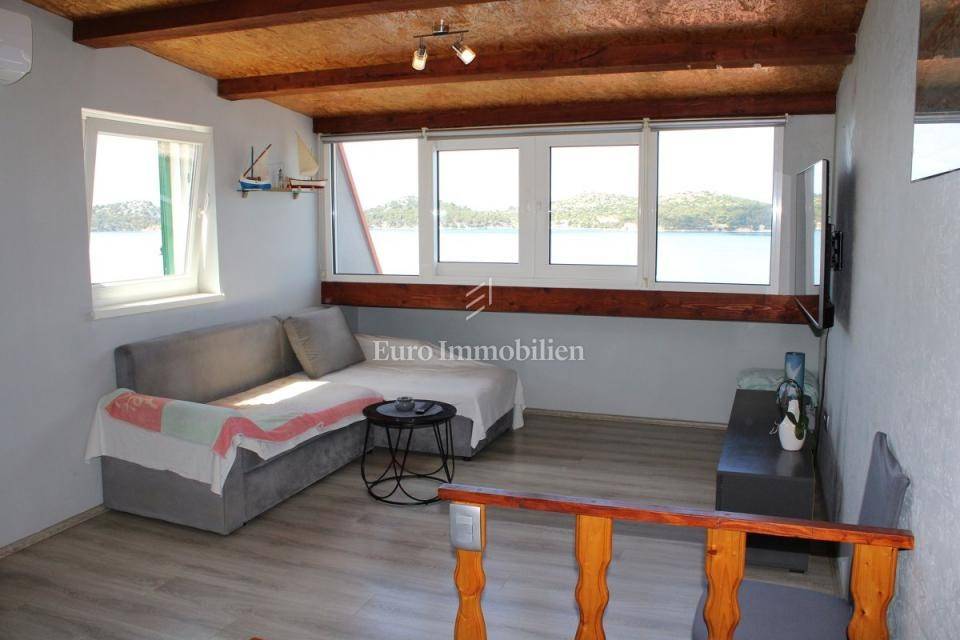 Semi-detached house for sale near Banj beach in Šibenik. The house extends over the ground floor, first floor and attic. It is divided into two apartments, each with 50 m2. The ground floor of the house and the auxiliary building form one apartment, and have a separate entrance. It consists of a living room, dining room, kitchen, bathroom and bedroom. External stairs lead to the apartment on the first floor, where there is a bedroom and a bathroom. Internal stairs lead to the attic where there is a large kitchen and living room with a beautiful view of the sea and Banj beach. The house has a yard, a terrace, and additional auxiliary facilities. The yard can be accessed by car. It has one parking space.