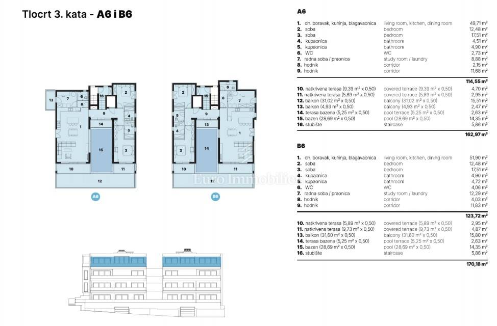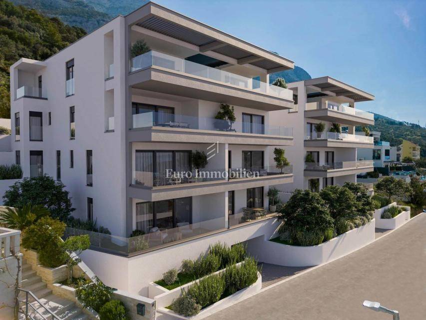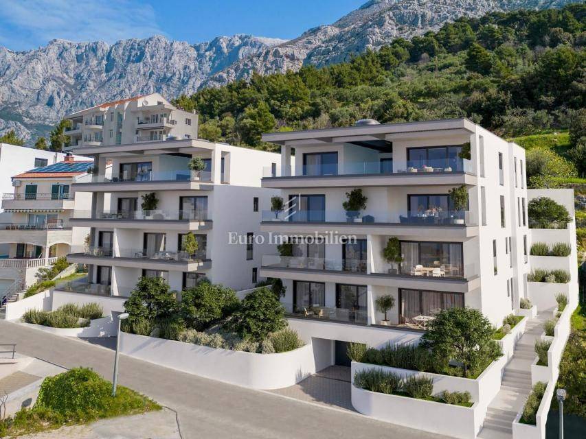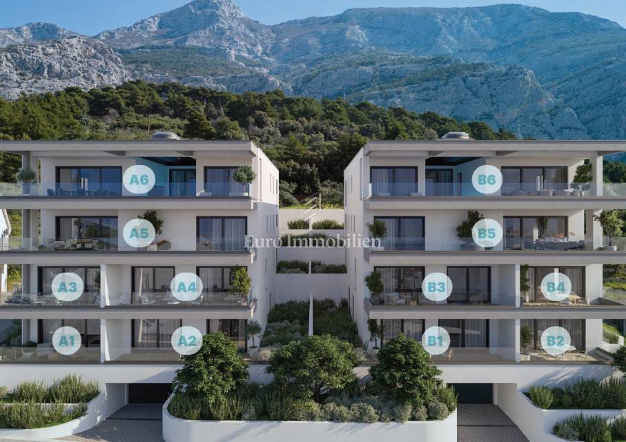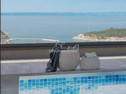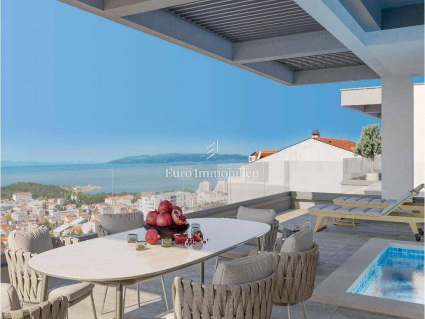 Three-bedroom apartment in a new building above the center of Makarska with a phenomenal panoramic sea view. Apartment A5 is located on the second floor of the building. Total area 171.05 m2, and consists of three bedrooms, hallway, hallway, three bathrooms, laundry room, kitchen with dining room, living room and spacious terrace and balcony with a total area of 41.60 m2 where a swimming pool will be built.