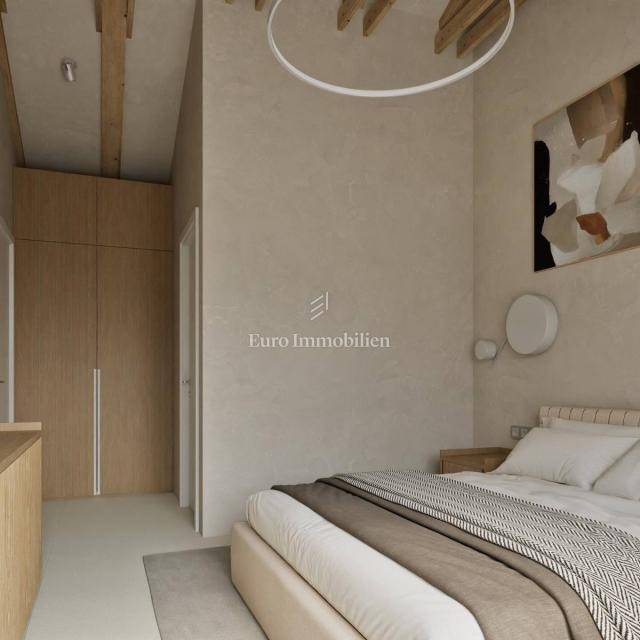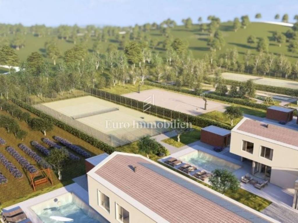 Luxury villa with a living area of 176 m2 on a spacious garden of 2,365 m2. The villa consists of a ground floor and an upper floor, with a swimming pool in a beautiful and quiet location in Istria. The ground floor is modernly decorated with an open space concept of the kitchen, dining room and living room, making the space functional and airy. This floor also has a storage room (indoor and outdoor), a sauna/fitness room, and access to a covered terrace with a summer kitchen and a heated swimming pool with a massage area (area 48 m2). Upstairs there are 4 bedrooms with en-suite bathrooms and access to the terrace. In addition to the outdoor pool, the beautifully landscaped garden also includes an auxiliary building serving as an outdoor storage area of 12 m2 and parking for 2 parking spaces.