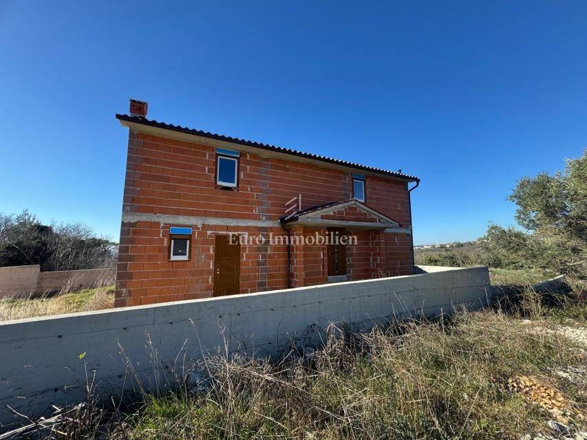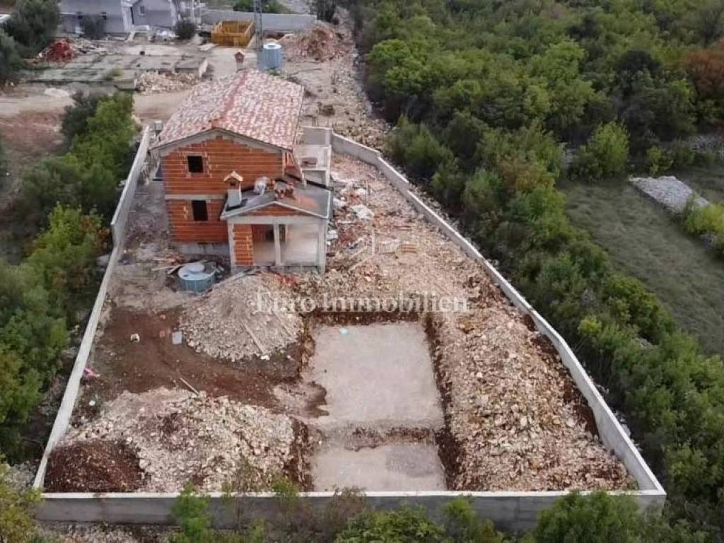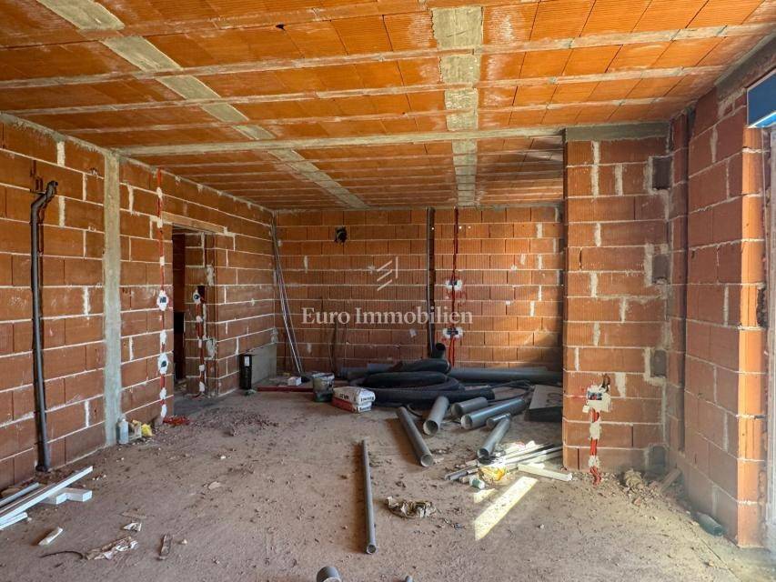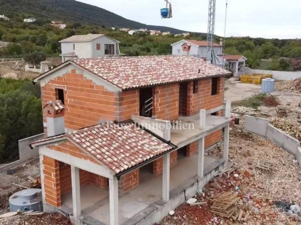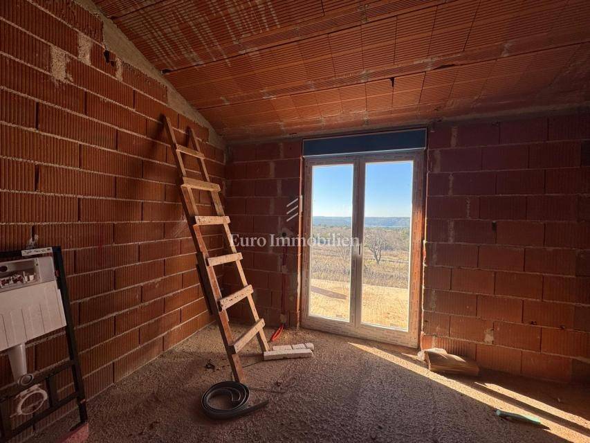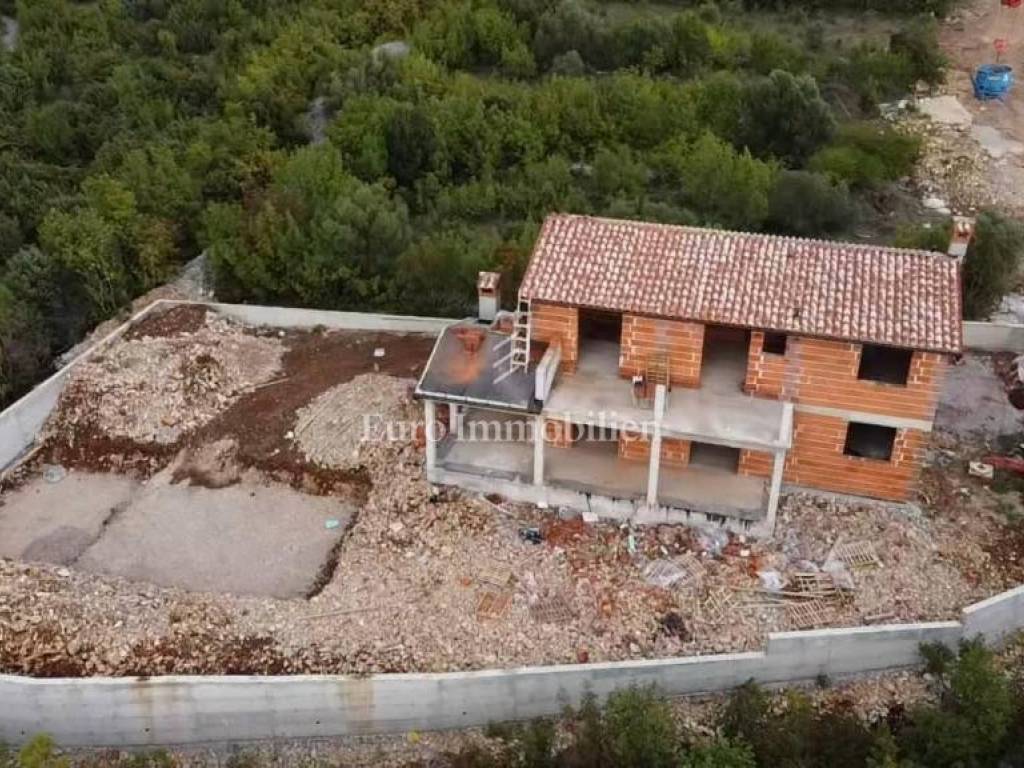 House under construction, located in a small and quiet village, not far from Labin, and only 2 km from the sea. The house is spread over two floors. On the ground floor there is an open concept space that combines the kitchen, dining room and living room, with access to a covered terrace. On the ground floor there is also a guest toilet, pantry, storage room and hallway. On the first floor there is a hallway, three bedrooms and two bathrooms that provide additional comfort and privacy. From the first floor there is an exit to a terrace with a beautiful sea view. The property is being sold in the unfinished phase, which allows you to complete it according to your own wishes and needs.