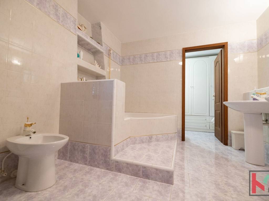 - Drugi kat: master spavaća soba s elegantnim namještajem, velika kupaonica (kada, tuš, bide, WC, dva umivaonika), utility prostor s ormarima i perilicom rublja. Balkon sa zapadnom orijentacijom i pogledom sve do Savudrije i Poreča.