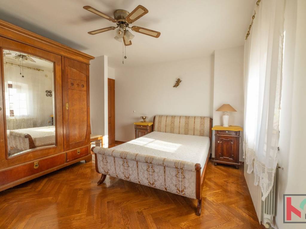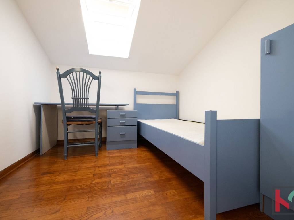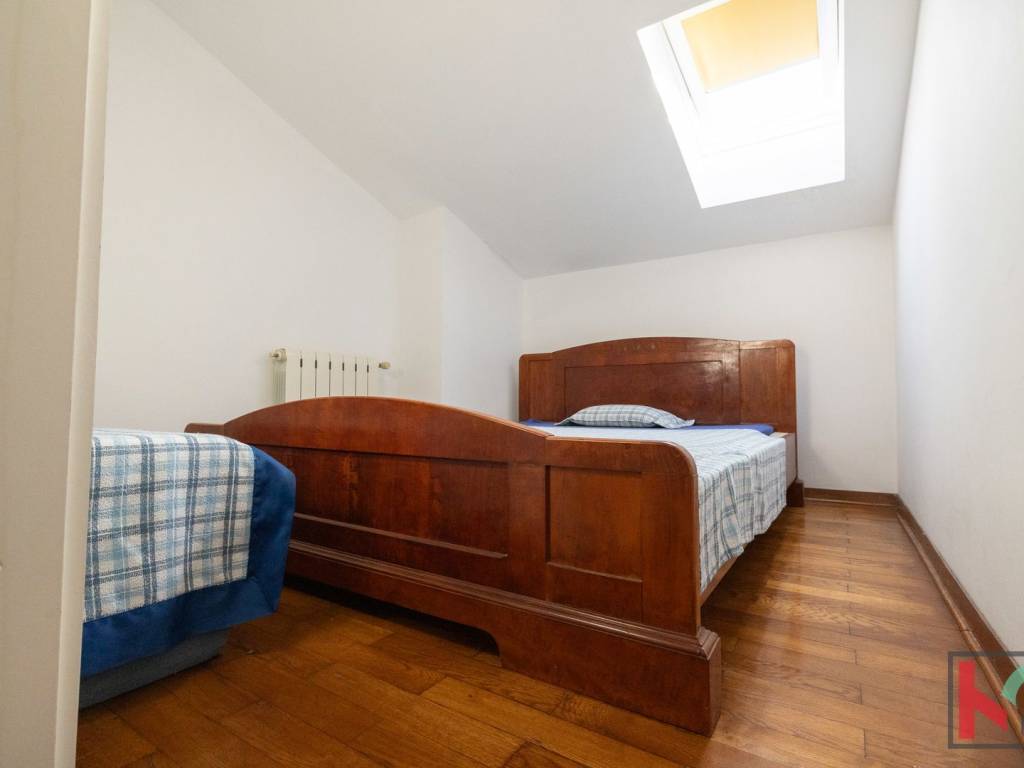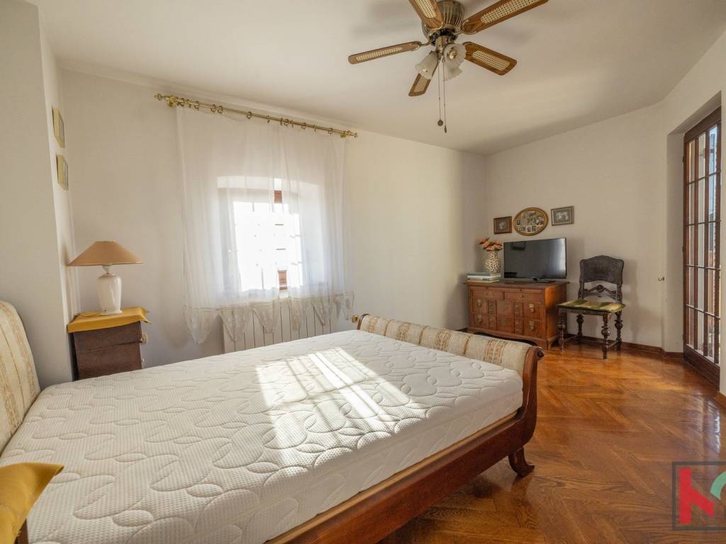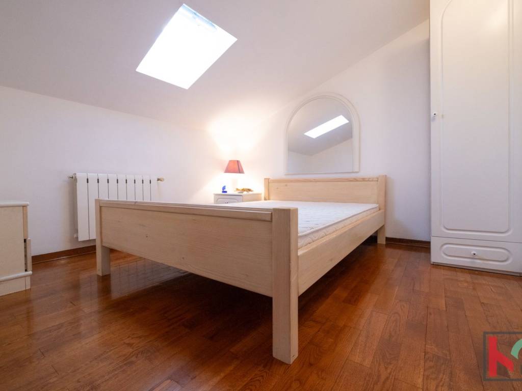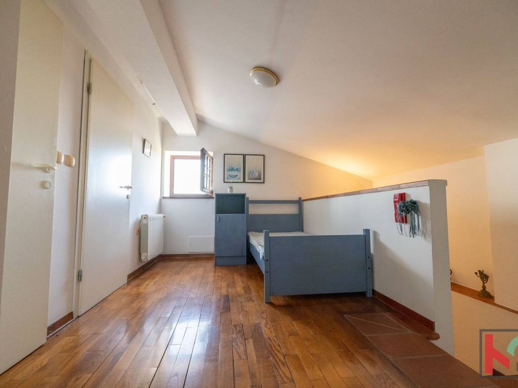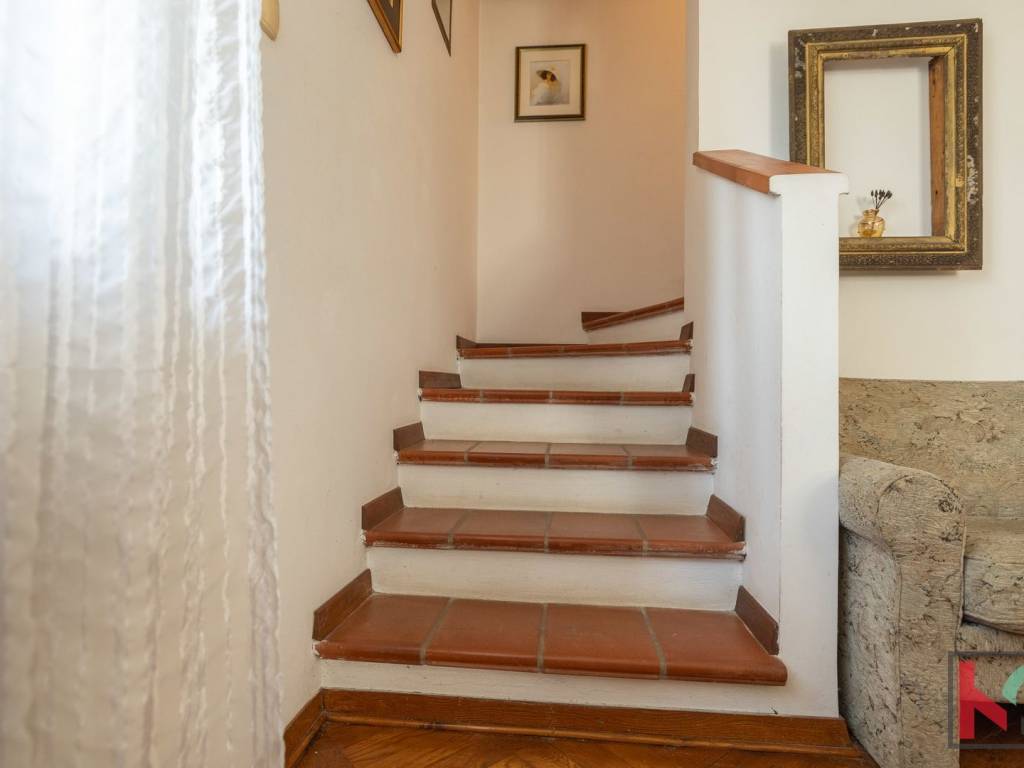 Master spavaća soba ima izlaz na manji balkon sa zapadnom orijentacijom, s kojeg se pruža očaravajući panoramski pogled – od Triglava, Savudrije pa sve do Poreča. Unutarnje stubište koje povezuje sve etaže obloženo je kvalitetnom terracottom, dok su sobe uređene hrastovim parketom, a kupaonice obložene keramikom. Ugrađena je drvena stolarija rađena po mjeri, a u potkrovlju su postavljeni Velux krovni prozori s unutarnjim sjenilima koji osiguravaju ugodnu svjetlost i ventilaciju.