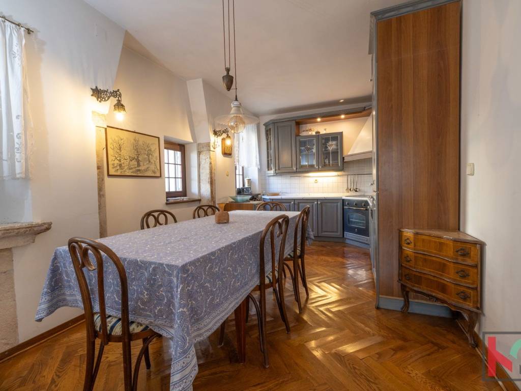 U samom središtu pitoresknog istarskog mjesta nalazi se ova predivna kamena obiteljska kuća, temeljito obnovljena 1997. godine. Tijekom renovacije izrađene su nove unutarnje zidne konstrukcije, nova nosiva ploča, uređena je mansarda te kompletan interijer kroz sve četiri etaže – uz očuvane autentične detalje i visoku razinu udobnosti.