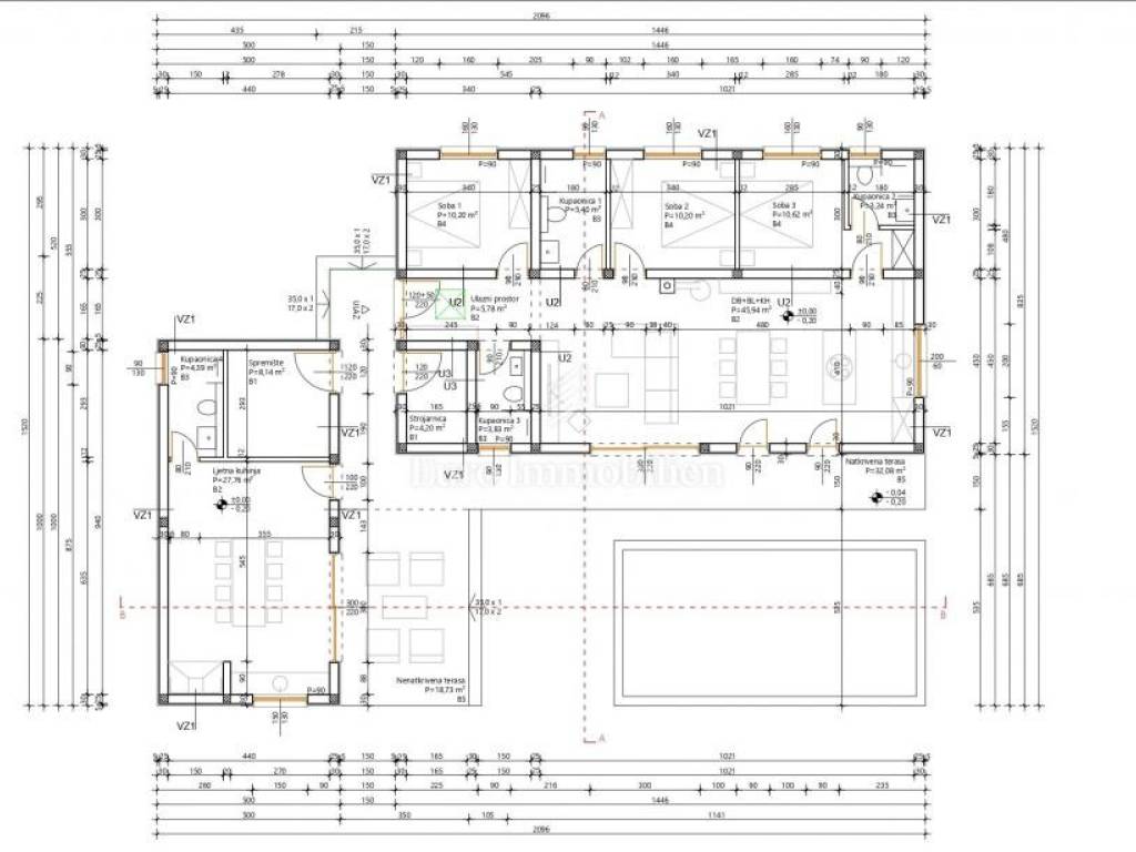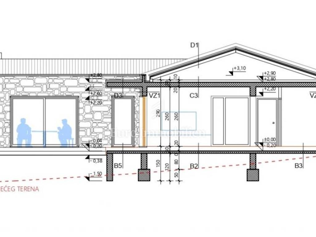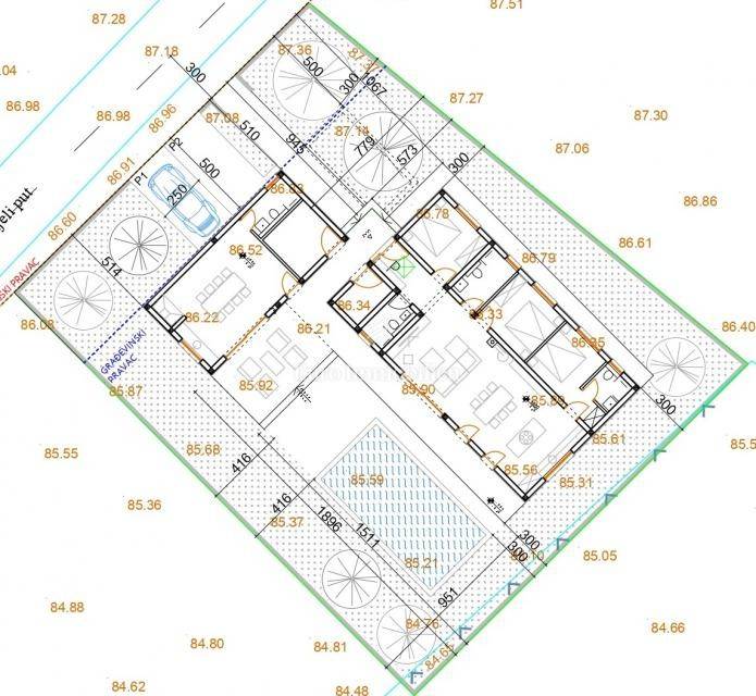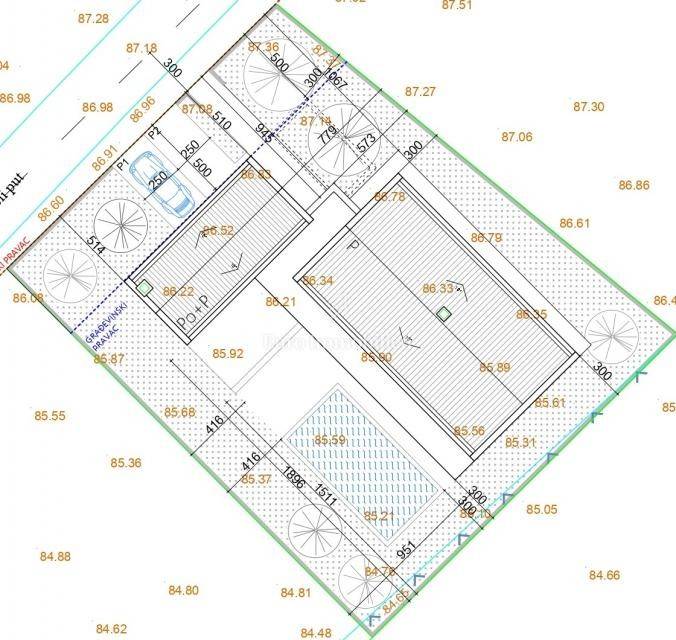 Građevinsko zemljište s pogledom na more i pravomoćnom građevinskom dozvolom za kuću prizemnicu. Teren je pravilnog kvadratnog oblika ukupne površine 659 m2; pristup s ceste. Voda i struja nalaze se neposredno uz teren. Po prostornom planu minimalna površina za gradnju samostojeće kuće iznosi 400 m2. Mogućnost izmjene građevinske dozvole za gradnju dodatnog kata! Prema projektu planiran je i bazen.