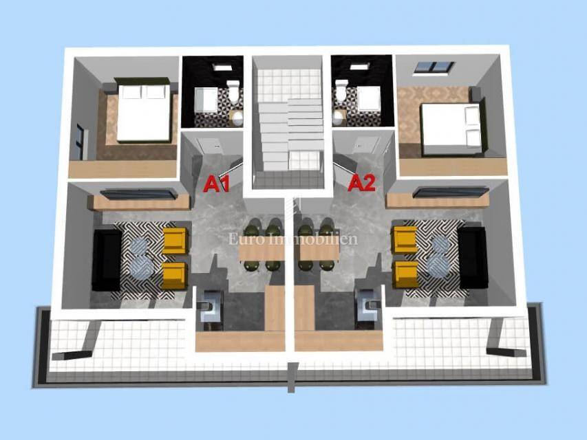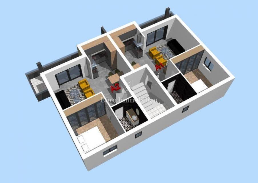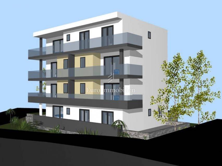 The urban villa consists of a total of 6 apartments, one-bedroom apartments of 54.43 m² and 54.63 m² and the last unit still for sale a three-bedroom penthouse of 109.71 m². The building consists of a basement with garages, and the possibility of purchasing a garage is at a price of 25,000 euros. There are apartments on the ground floor and on 3 floors. There is also the possibility of purchasing an outdoor parking space at a price of 18,000 euros. The apartments are well-equipped, top-quality materials are used, they are air-conditioned, and underfloor heating is installed in the living rooms and bathrooms. Security doors have been installed at the entrance to the apartment, and the bathroom is fully equipped for use. The apartments have TV, satellite and internet connections in each room. External PVC openings are equipped with roller shutters, and there are also glass railings. The property is located approximately 700 meters from the sea and the city center, and a few minutes' walk separates it from the shopping center, sports fields and the waterfront. The planned move-in is in June 2026. The building permit and ownership are in order.