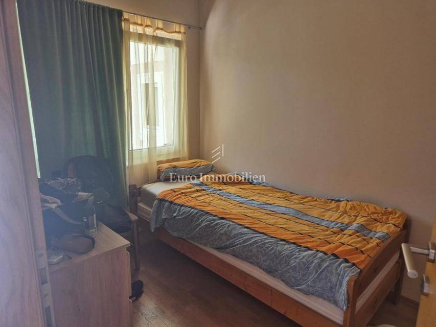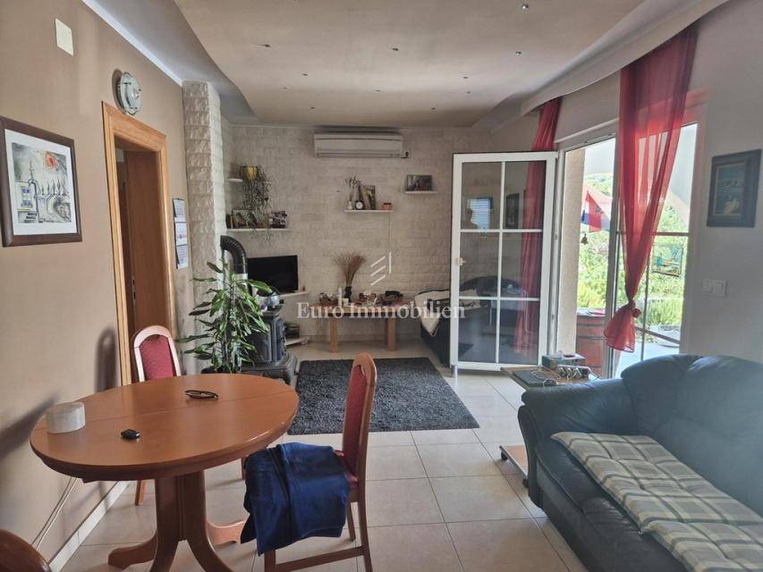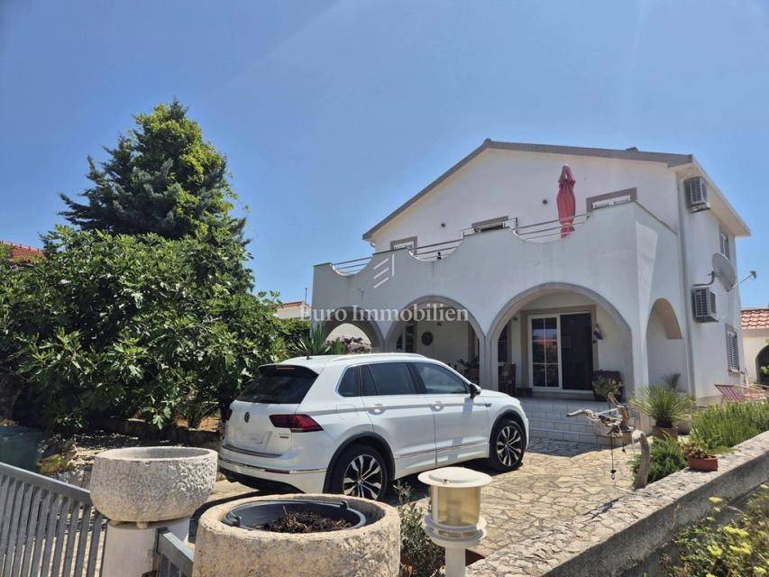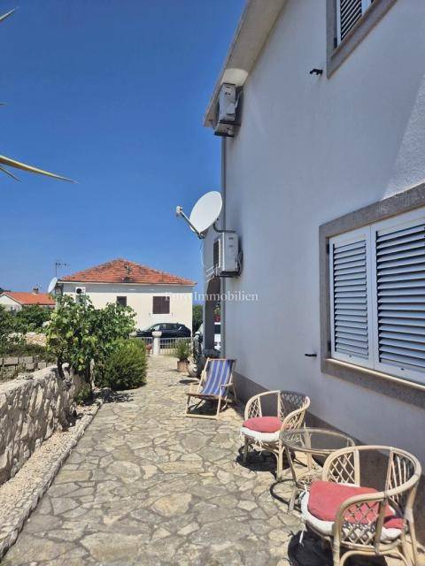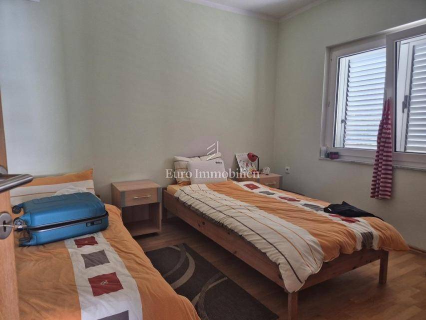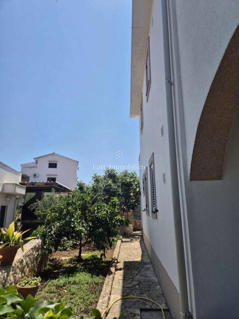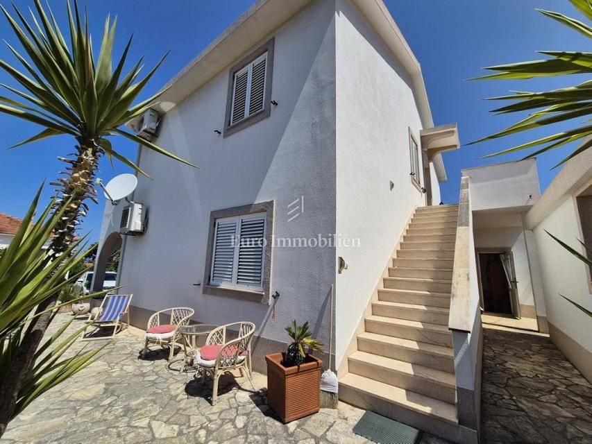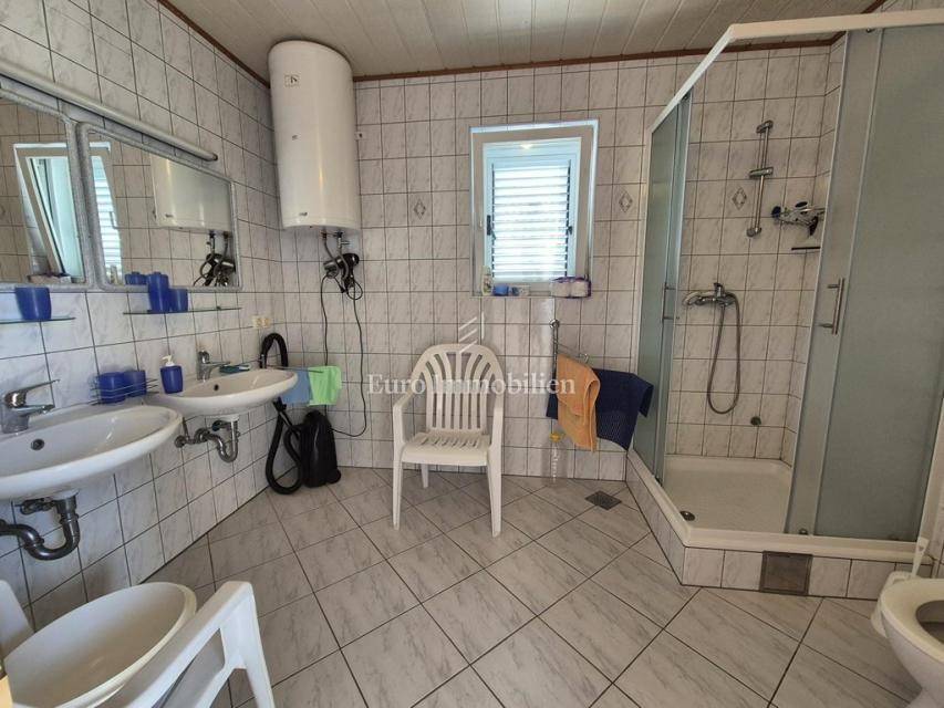 The house consists of two apartments. The ground floor apartment consists of two bedrooms, a living room, a kitchen, a dining room and a bathroom. The apartment on the first floor consists of three bedrooms, a living room, a kitchen, a dining room and a bathroom. It is located near the sea and a well-maintained beach. There is space in the yard for building a swimming pool.