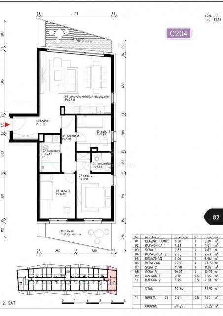 The apartment consists of an entrance hall, a living area (kitchen, dining room, living room) with access to a balcony, three bedrooms and two bathrooms, two of which have access to another balcony of 8.75 m2. The apartment has a total net area of 92.34 m2.