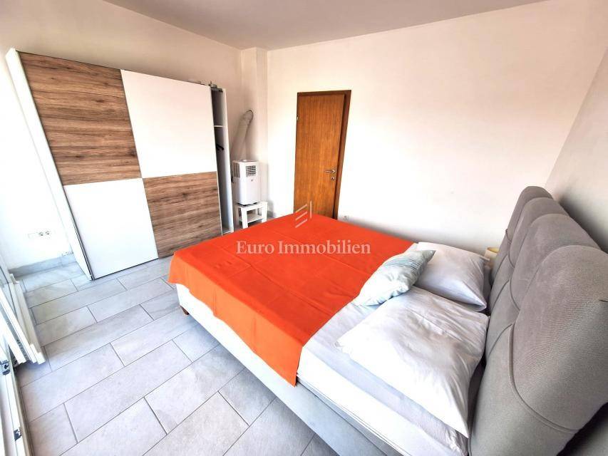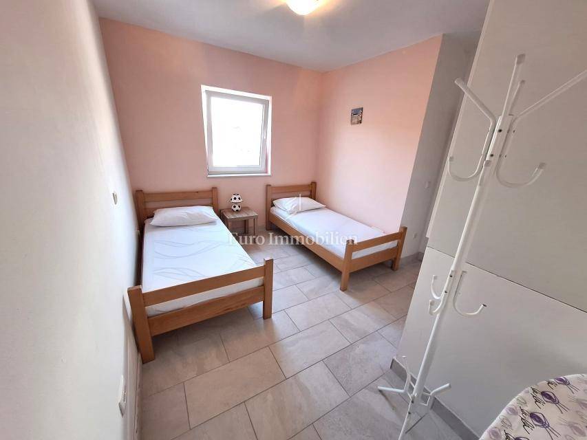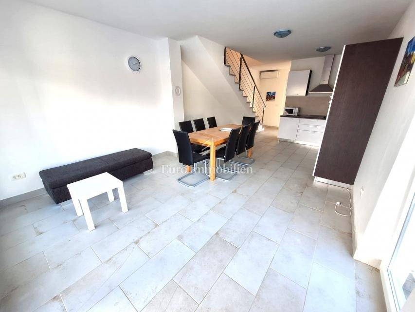 A two-storey apartment of 64.13 m2 with a 200 m2 garden with a swimming pool is for sale. The apartment consists of a ground floor and an upper floor. The ground floor has a living room with a kitchen and dining area, a toilet and a terrace. The upper floor has two bedrooms, a bathroom and a terrace. Air-conditioned, furnished. The neat garden has a swimming pool, barbecue and a garden house. Beautiful location 5 minutes drive from Malinska.