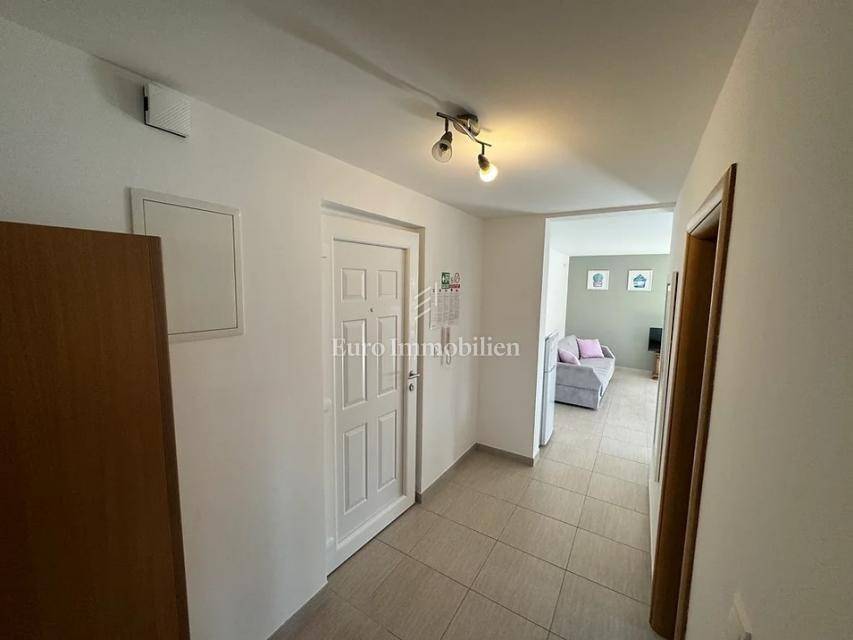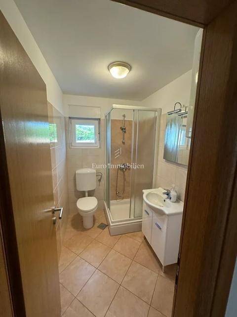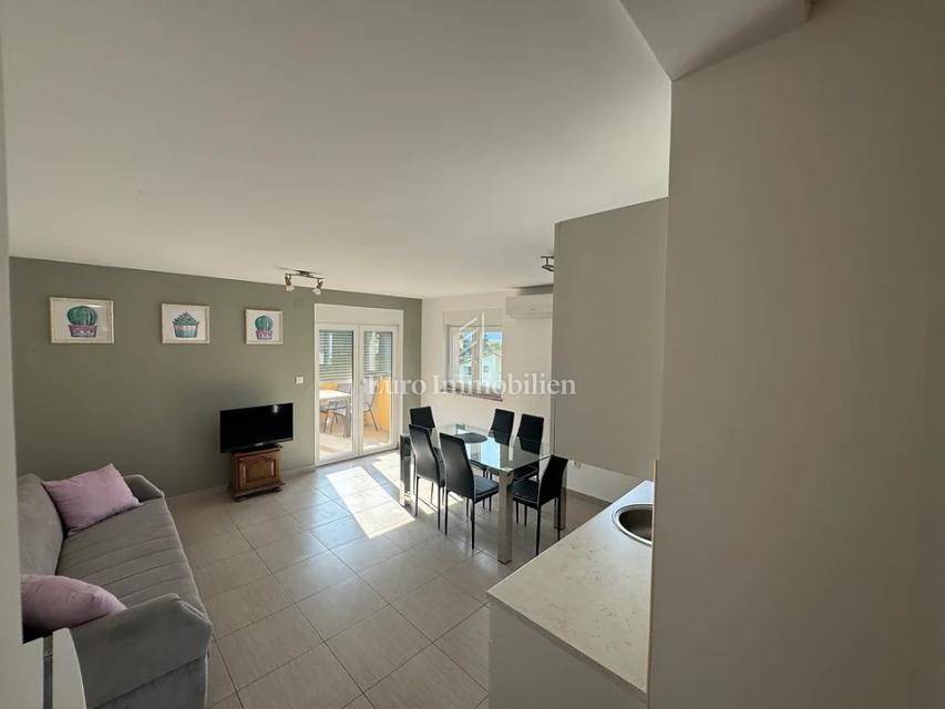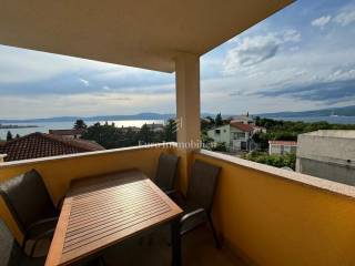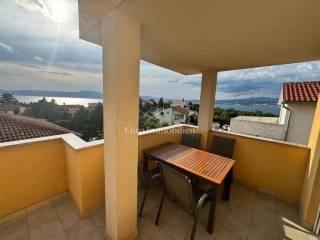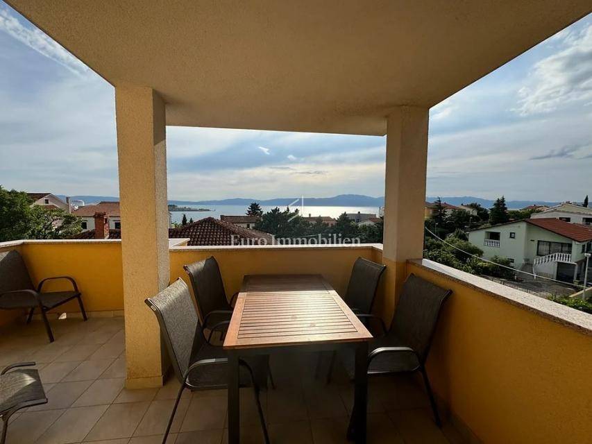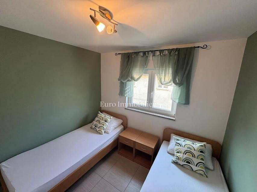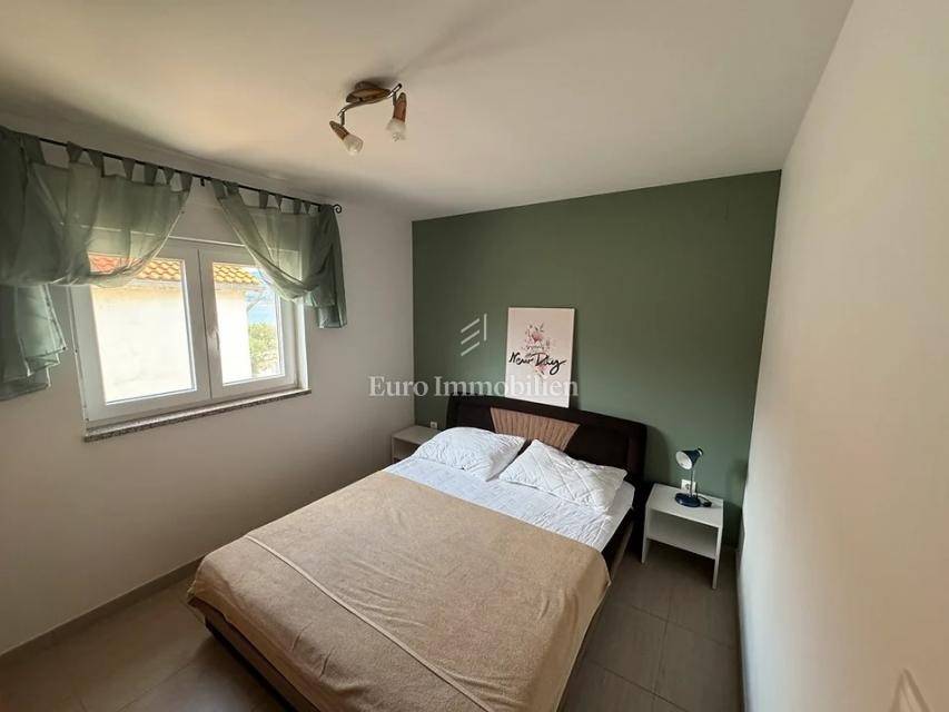 Island of Krk, Omišalj, apartment for sale on the second floor of 60 m2. The apartment consists of a living room with kitchen and dining area, a terrace with a beautiful sea view that is partially covered, two bedrooms and a bathroom. The apartment is sold with furniture and equipment, completely ready to use. On the ground floor it is possible to use part of the garden with a grill, and it also has a basement of 7 m2 and one parking space. Opportunity for own use or tourist rental.