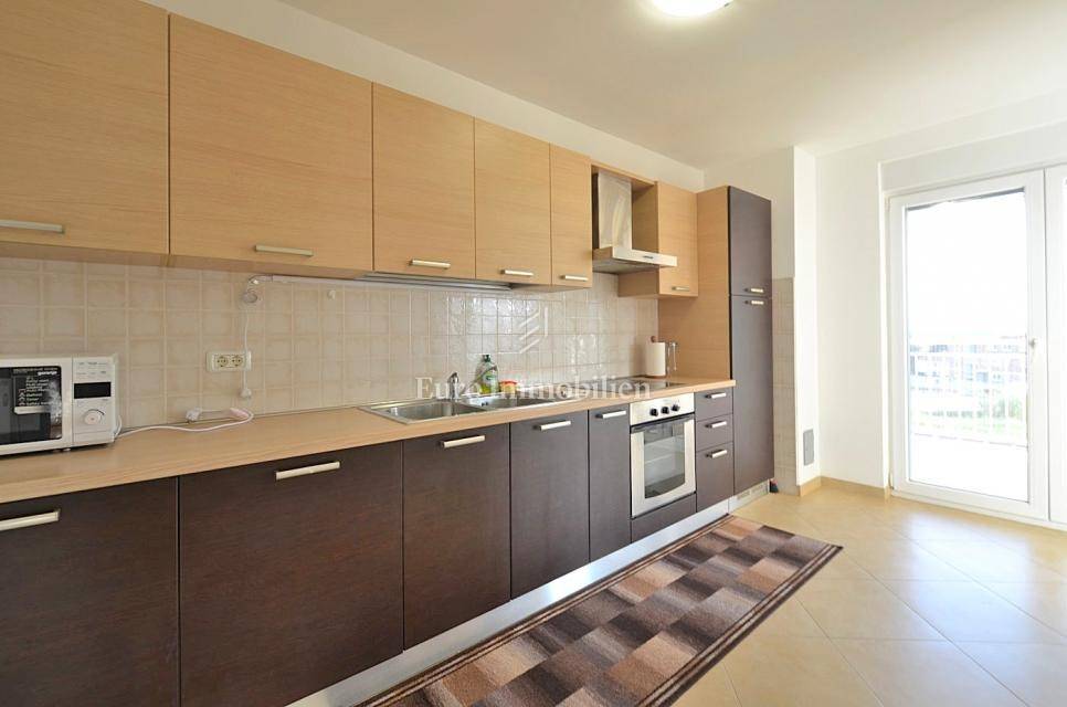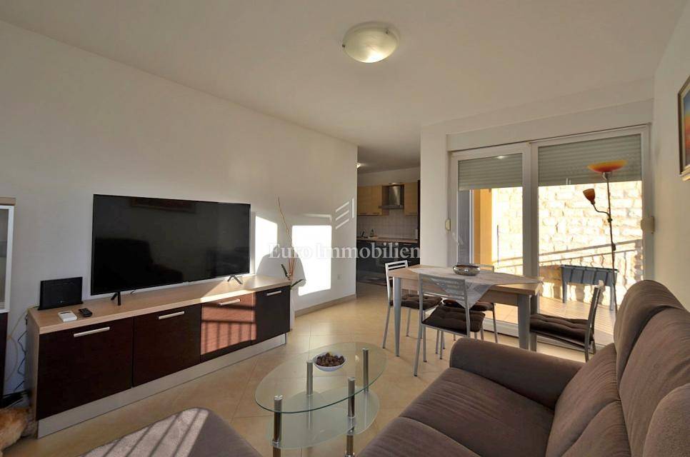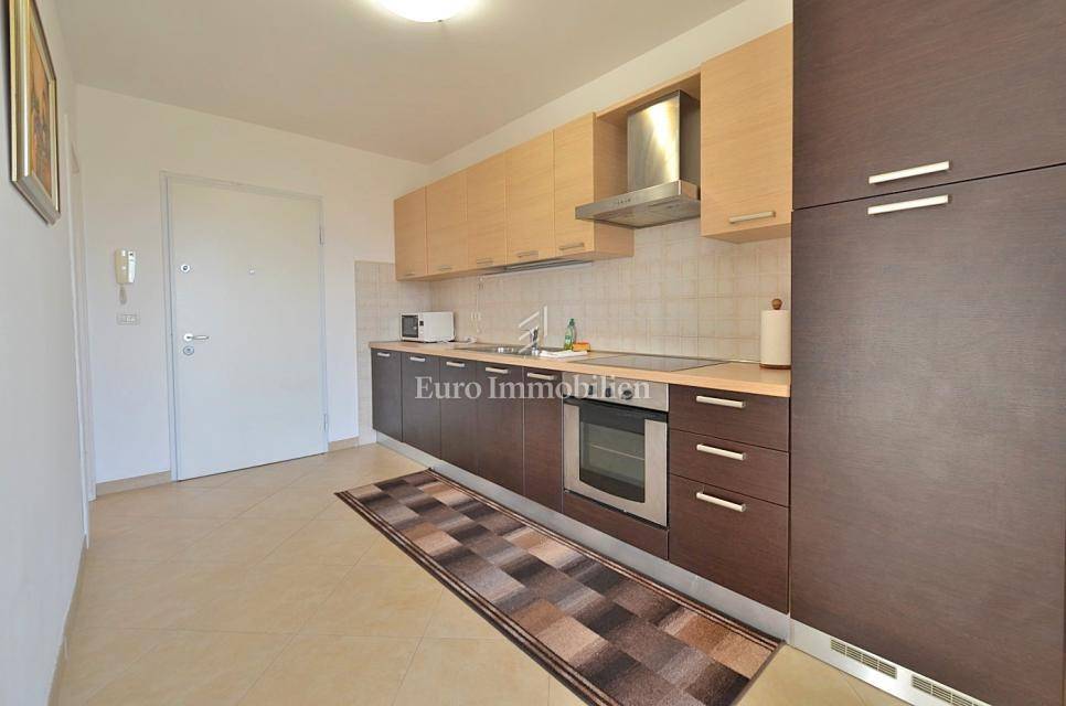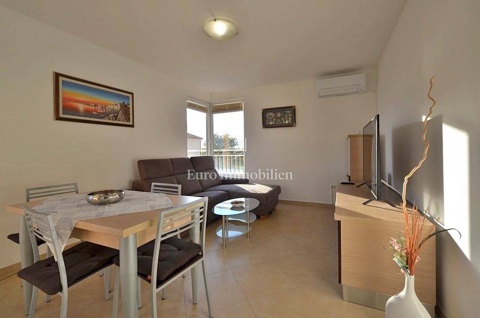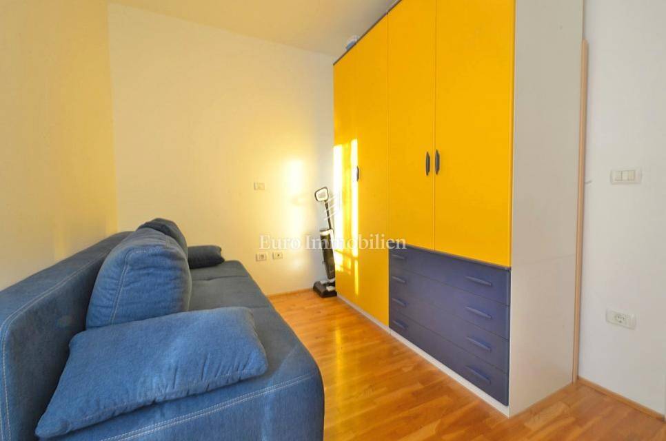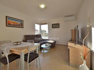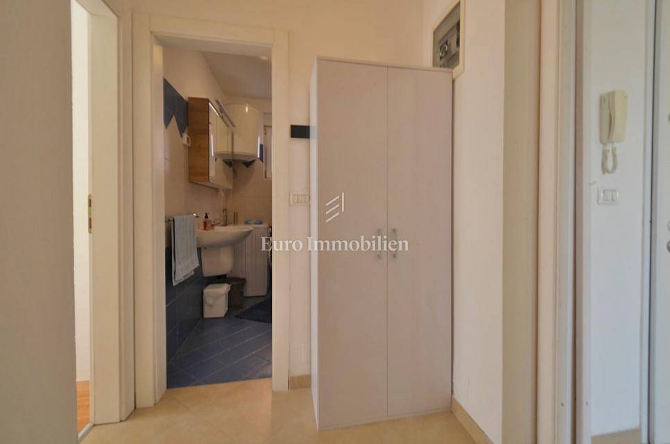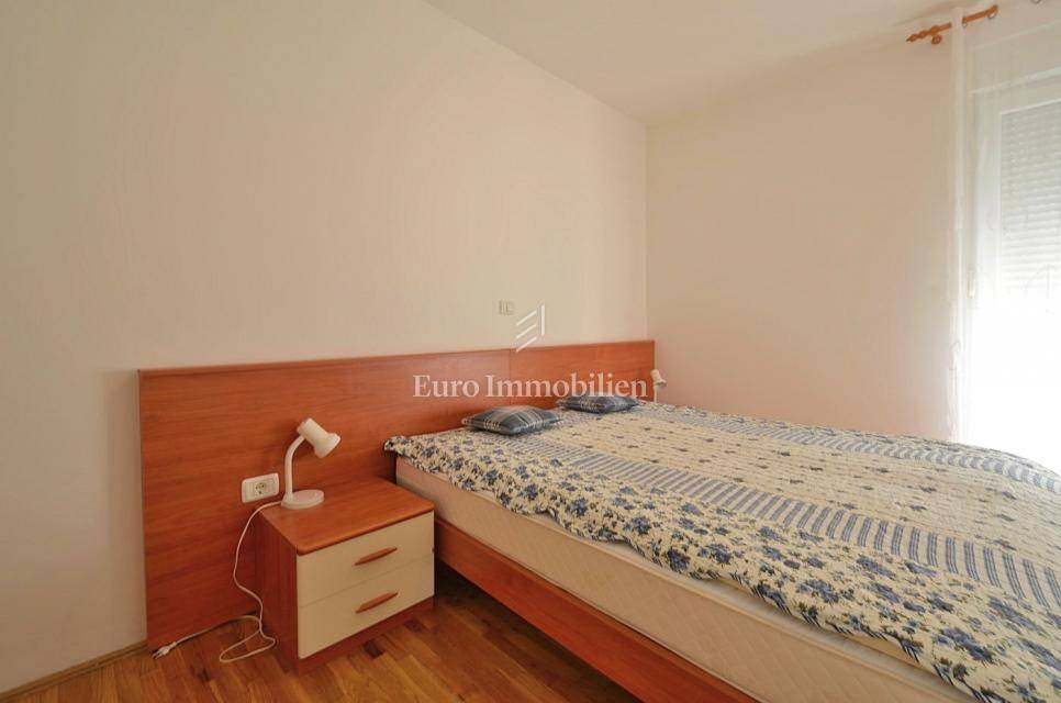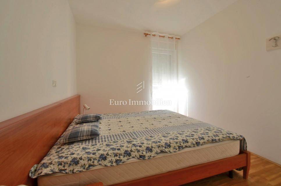 It consists of two bedrooms, and is equipped with a kitchen with appliances, which provides a comfortable living space. It also has a 5 m2 woodshed, and a terrace with a sea view. Air conditioning is used for heating and cooling, ensuring comfort throughout the year. The apartment has a parking space.