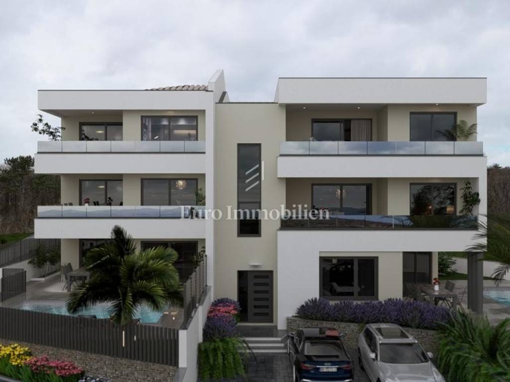 The apartment is located on the second floor and has an area of 100 m2. It consists of an open living room with kitchen and dining area, three bedrooms, two bathrooms, toilet and a large terrace with sea view. It is located in a quiet part of Vrbnik, 350 meters from the sea and 800 meters from the center. It is being sold on a "turnkey" basis, and the planned completion of the works is expected for the summer of 2026. Quality materials and equipment will be installed, all rooms will be air-conditioned and each apartment will have a designated 2 parking spaces. Contact us for more information and to arrange a viewing!
