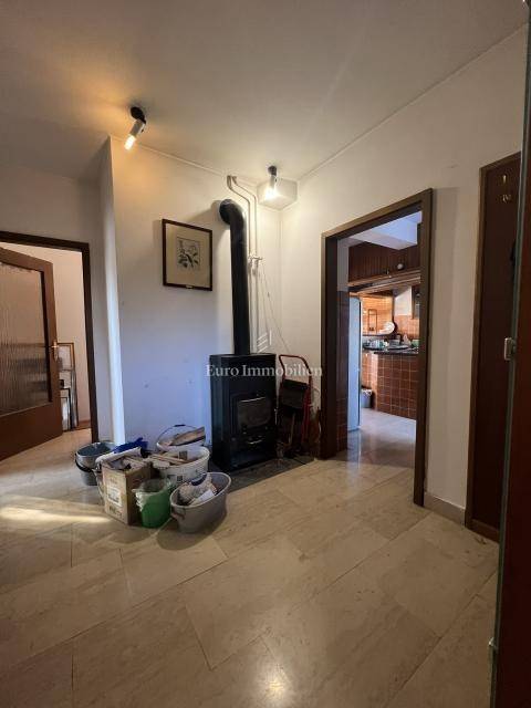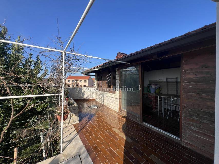 On the ground floor there is a comfortable two-bedroom apartment with a living room (2S+DB), with a total area of 95.39 m². The apartment has access to two large terraces with a total area of 69 m², direct access to the landscaped garden, and a summer kitchen. The apartment features a fireplace and an additional wood-burning stove, while the entire house is heated by central heating on fuel oil.
