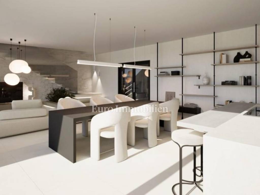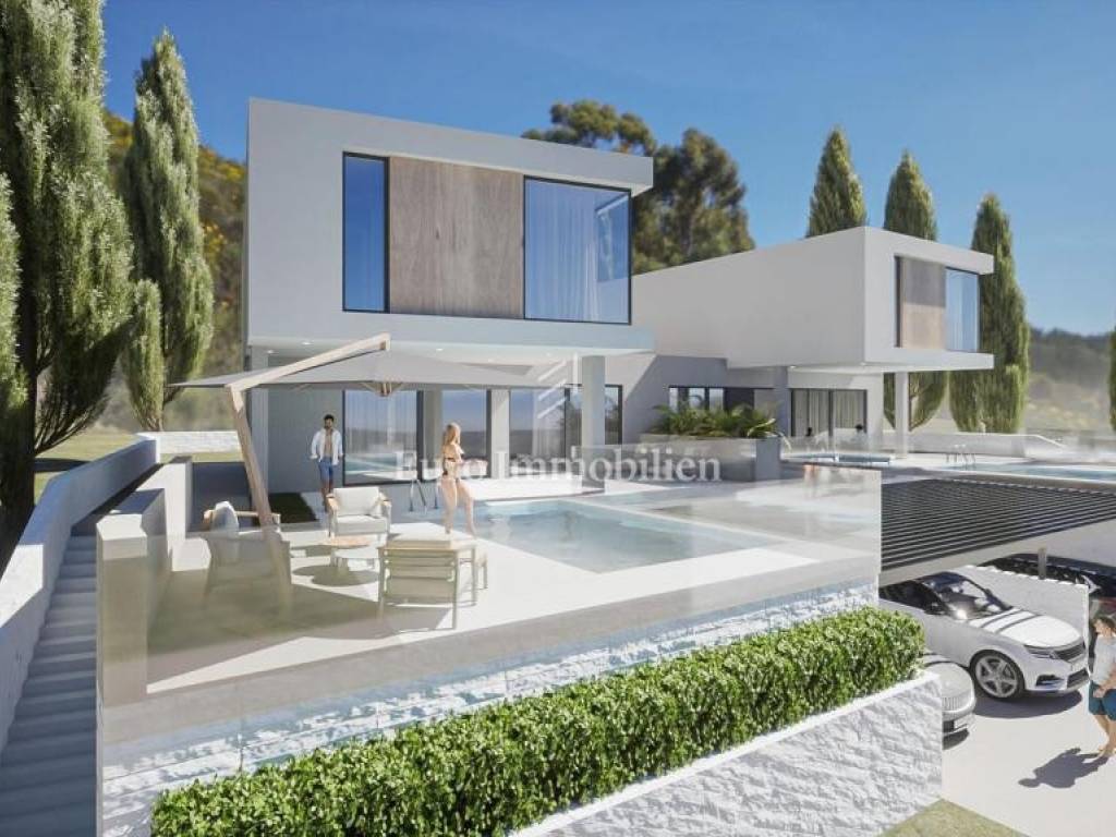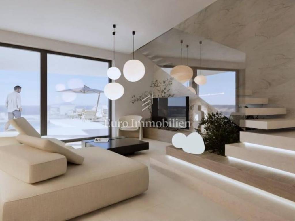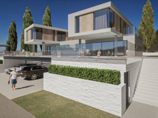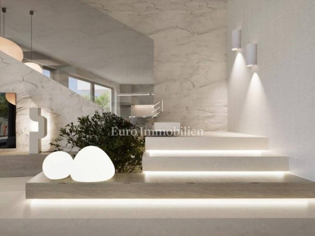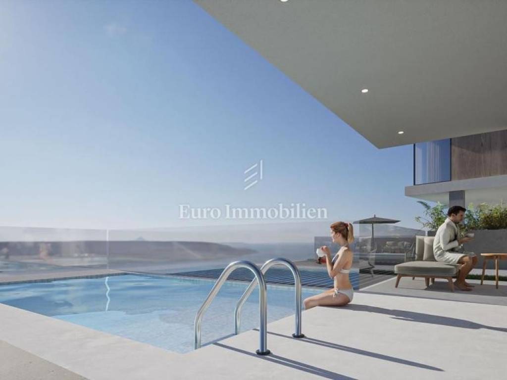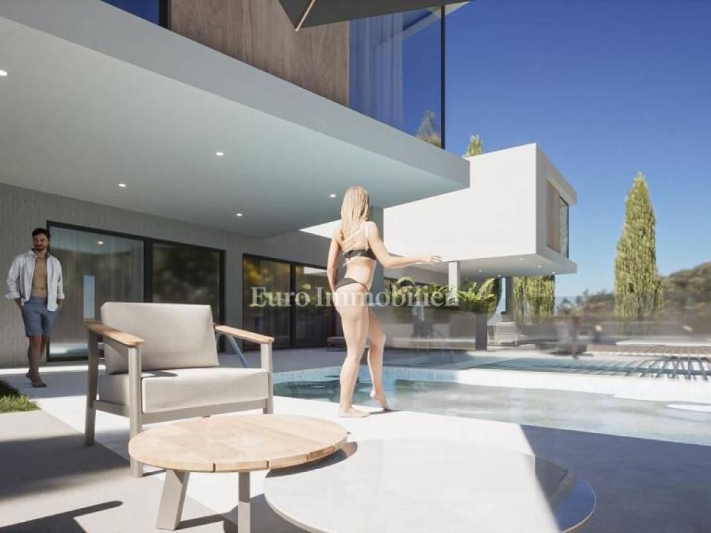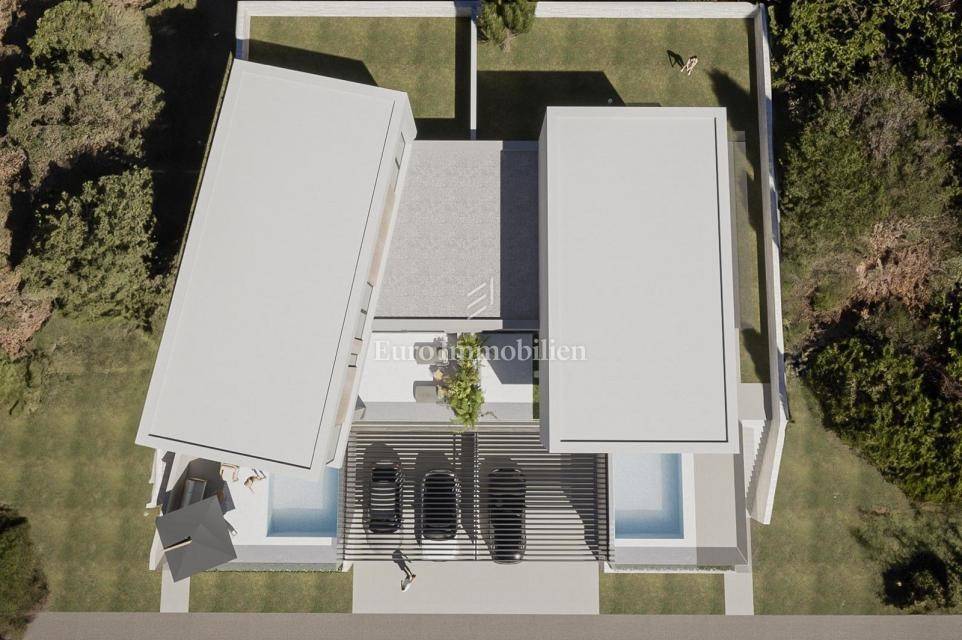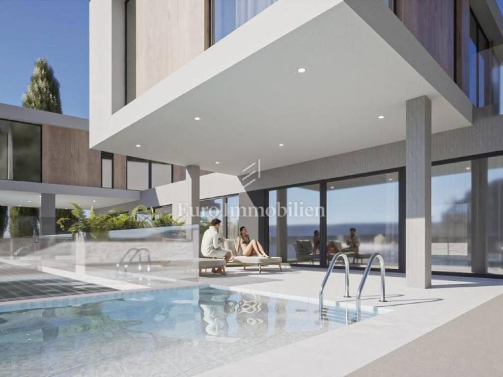 The house has the concept of a two-story apartment with a large overflow pool in front of the house and a landscaped garden in the back.