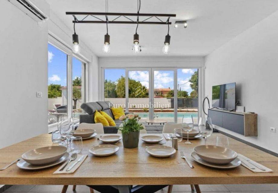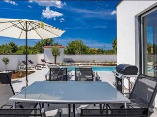 In a peaceful Istrian settlement, close to the charming town of Svetvinčenat, this modern single-storey villa combines contemporary architecture, functionality, and a pleasant Mediterranean atmosphere.
